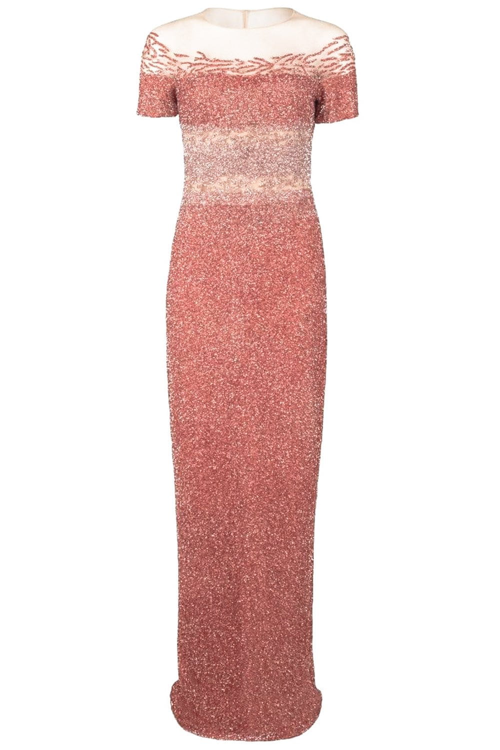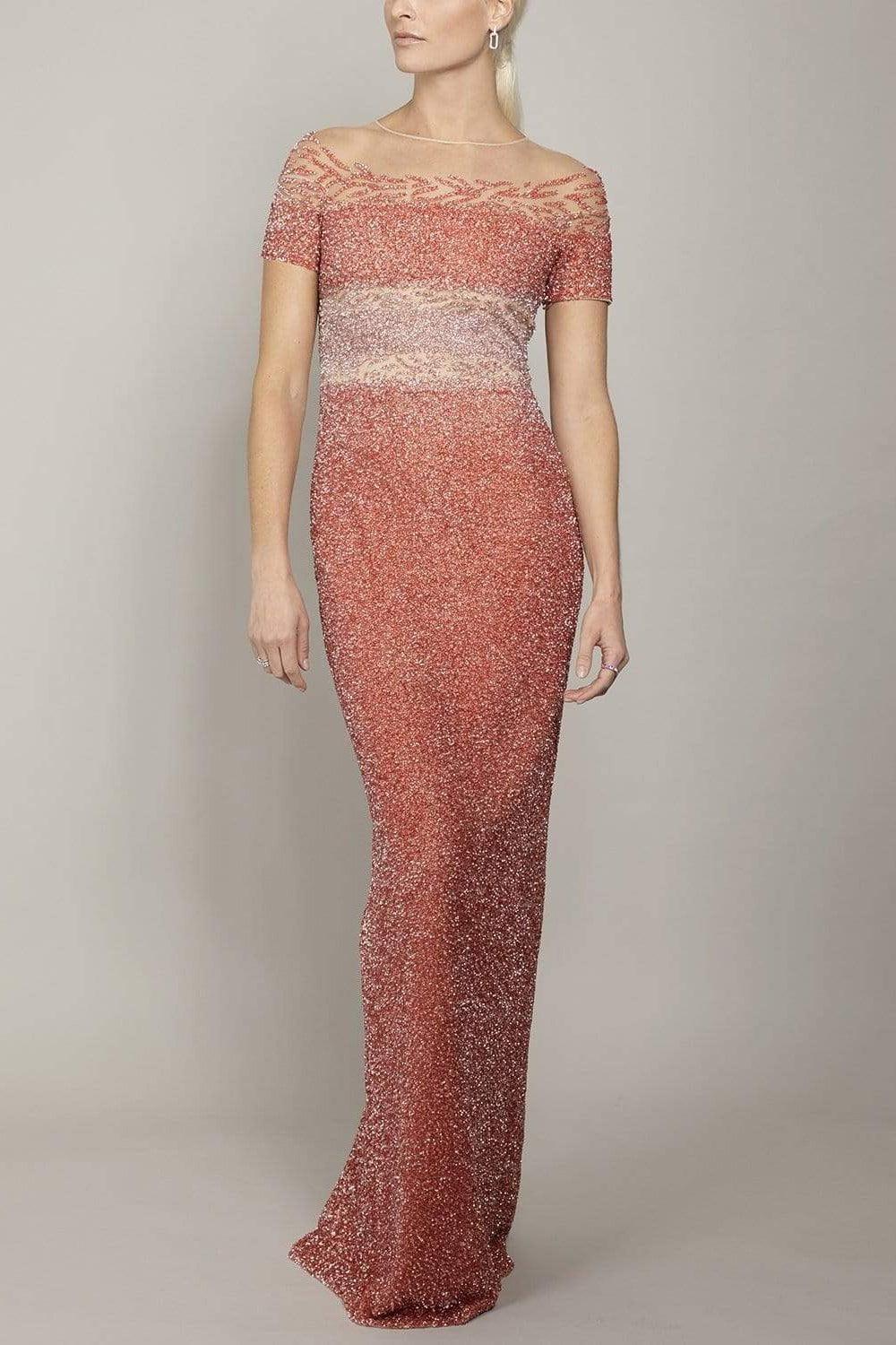 Pamela Roland coral ombre sequin hand embroidered gown with mesh illusion cut outs, jewel neckline, strapless illusion short sleeves, body-conscious silhouette and a concealed back zip closure.