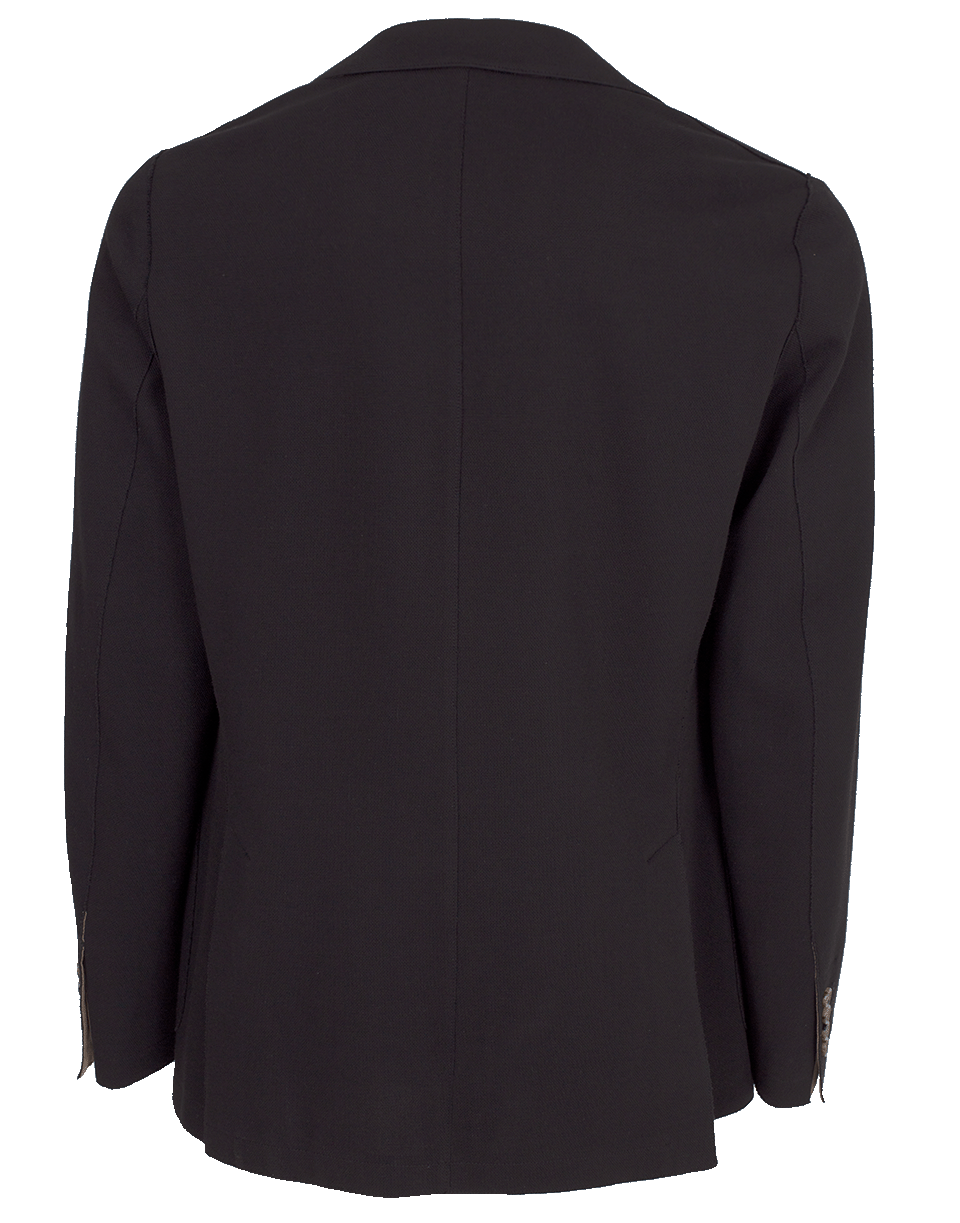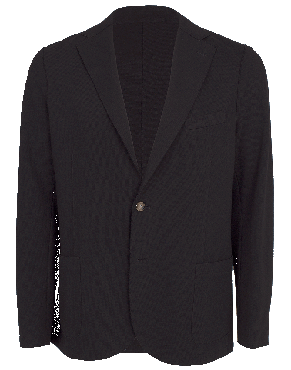 Black laser cut jacket from Eleventy featuring a classic cut with a notched lapels, side patch pockets, breat welt pocket, two front button closure, and a slim fit.