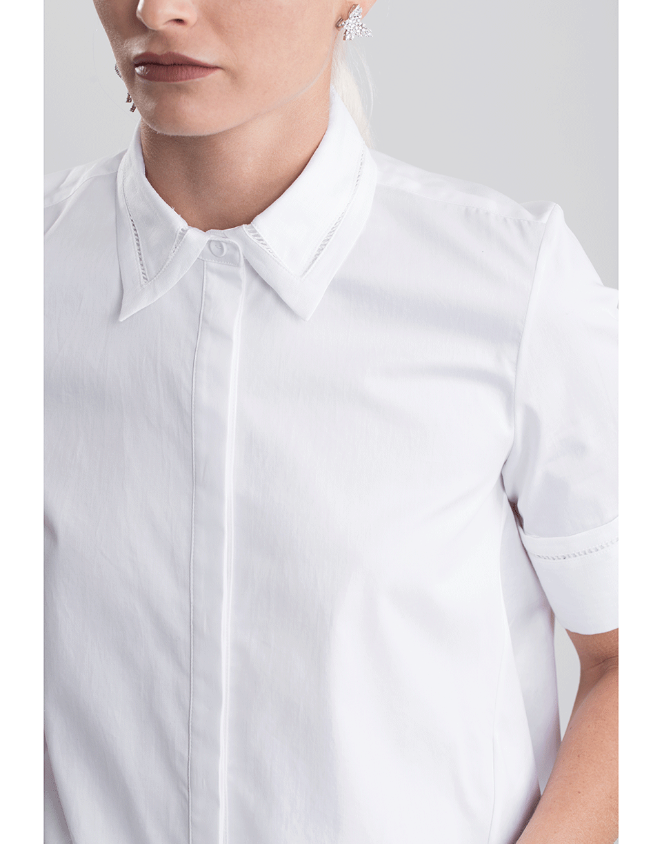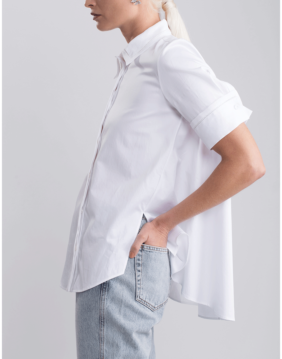 This crisp white poplin top from Adam Lippes features a loose trapeze silhouette with short sleeves, pointed collar, concealed button placket, and a spilt hem.
