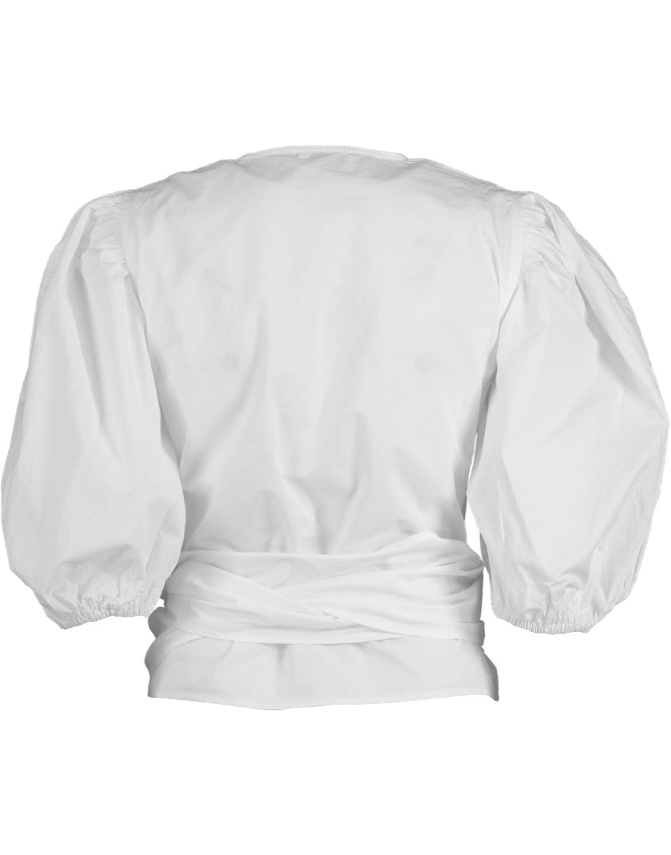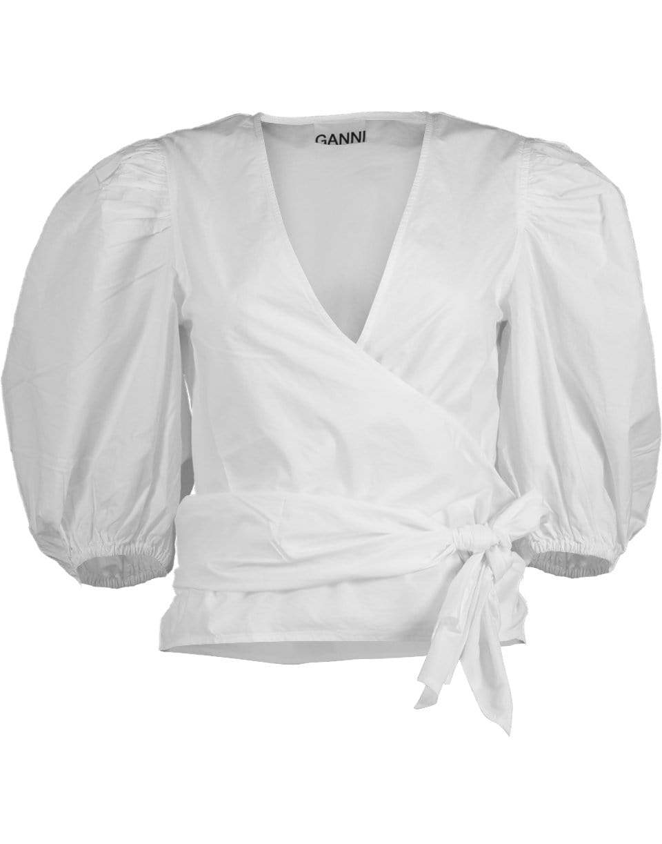 White cotton poplin wrap from Ganni featuring a slim waist, 3/4 length puff sleeves, V-neck, and a wrap silhouette.