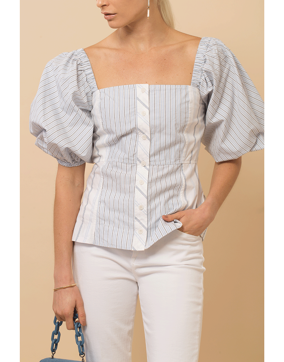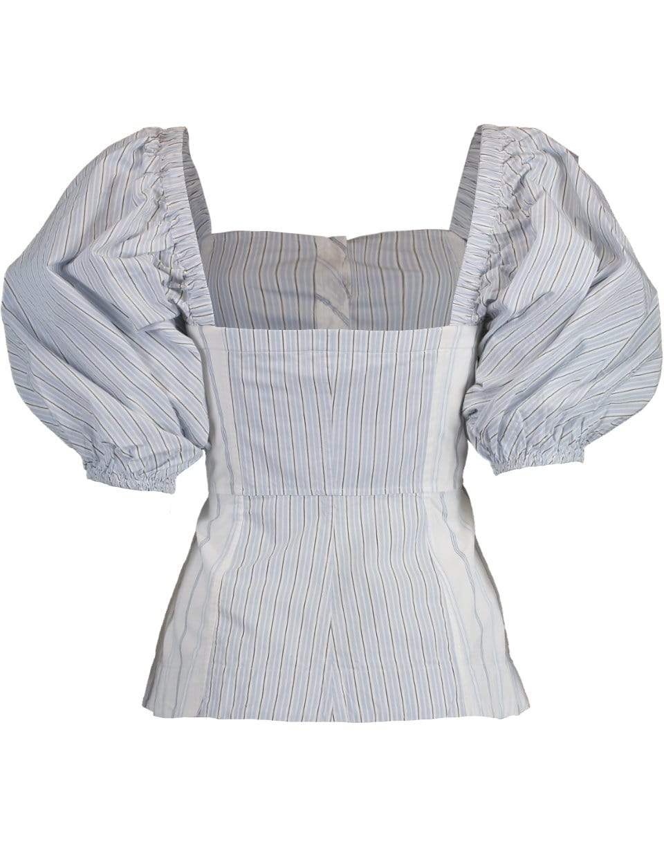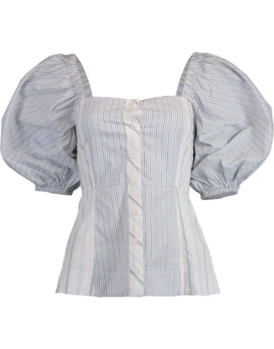 Lightweight organic cotton poplin striped square neck top from Ganni featuring elasticated puff sleeves, contrasting pinstripe panel design, fitted silhouette, and front button design.