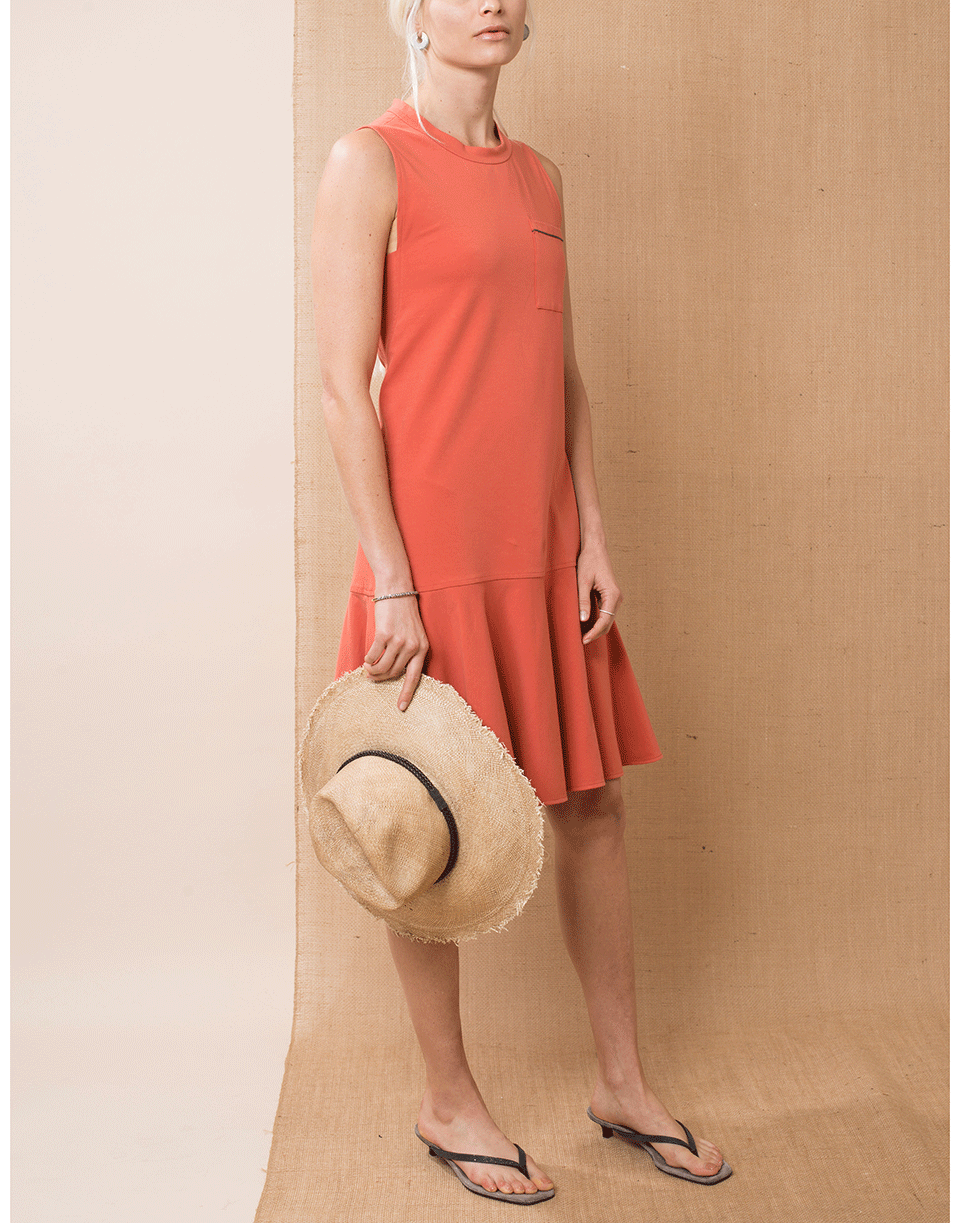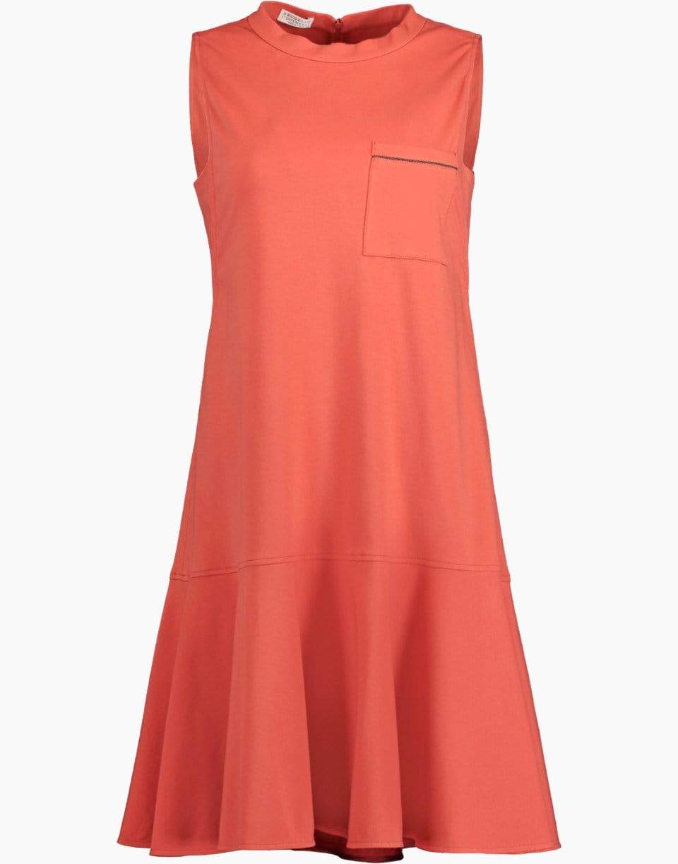 Brunello Cucinelli cotton stretch sleeveless ruffle hem dress with a crewneck, monili pocket detail, concealed zip closure at back, and a regular fit.