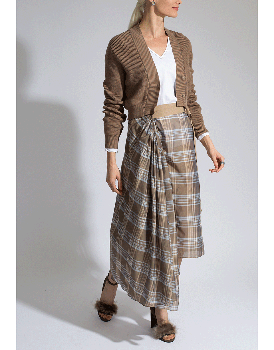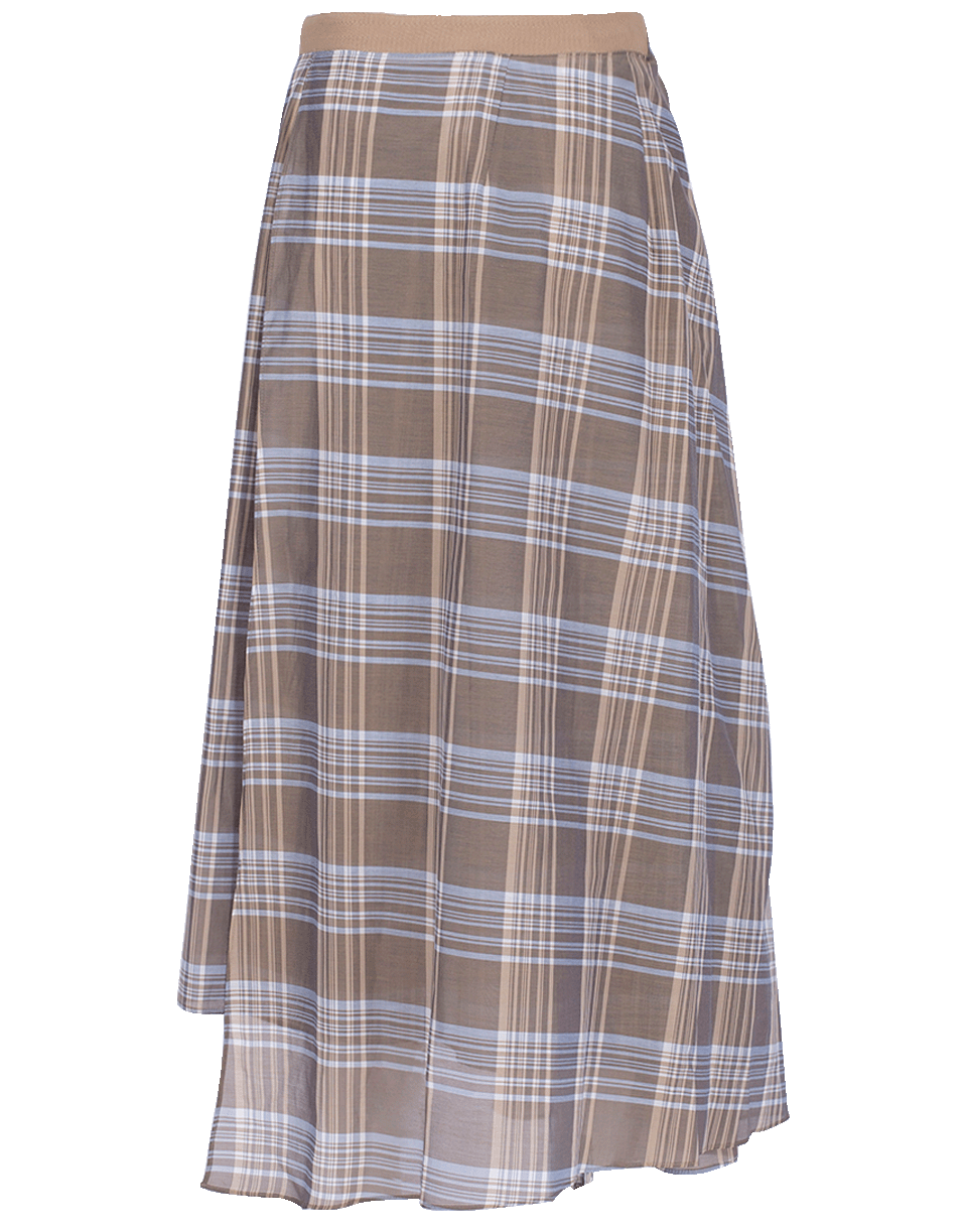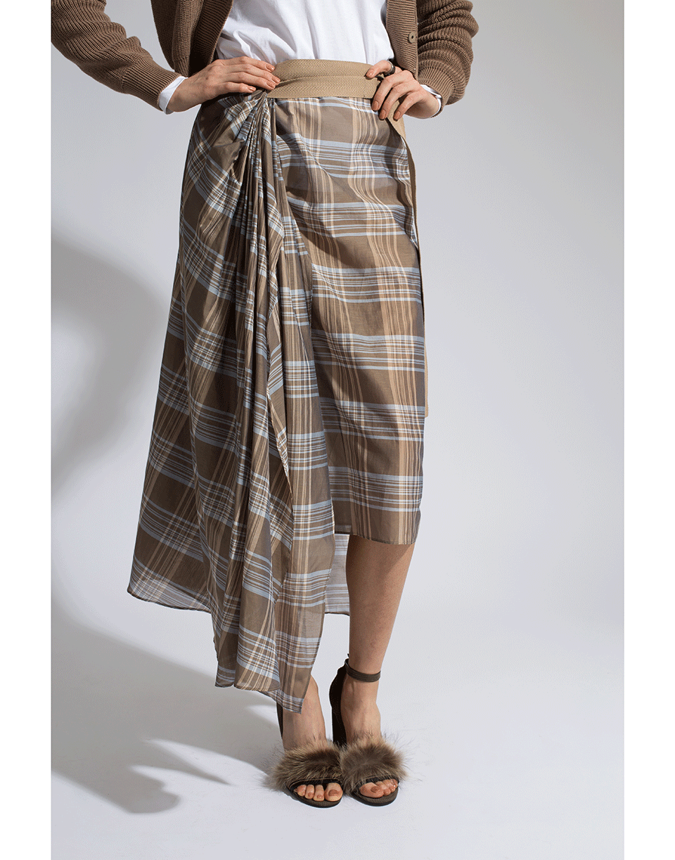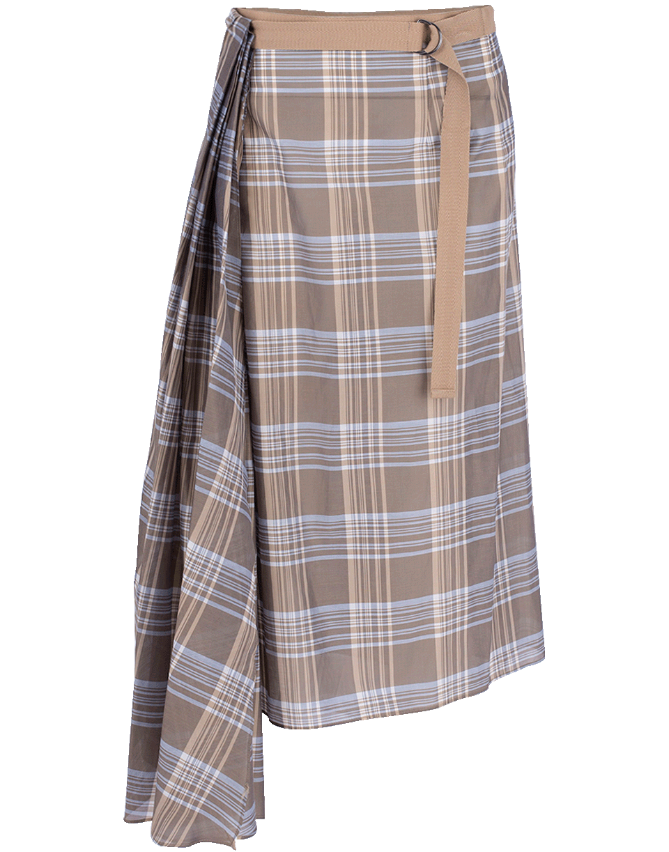 Wrap plaid skirt by Brunello Cucinelli. This light and breezysilk-blend checked midi skirt is designed to be worn at the waist, it features an asymmetric wrap silhouette that fastens with a D-ring belt.