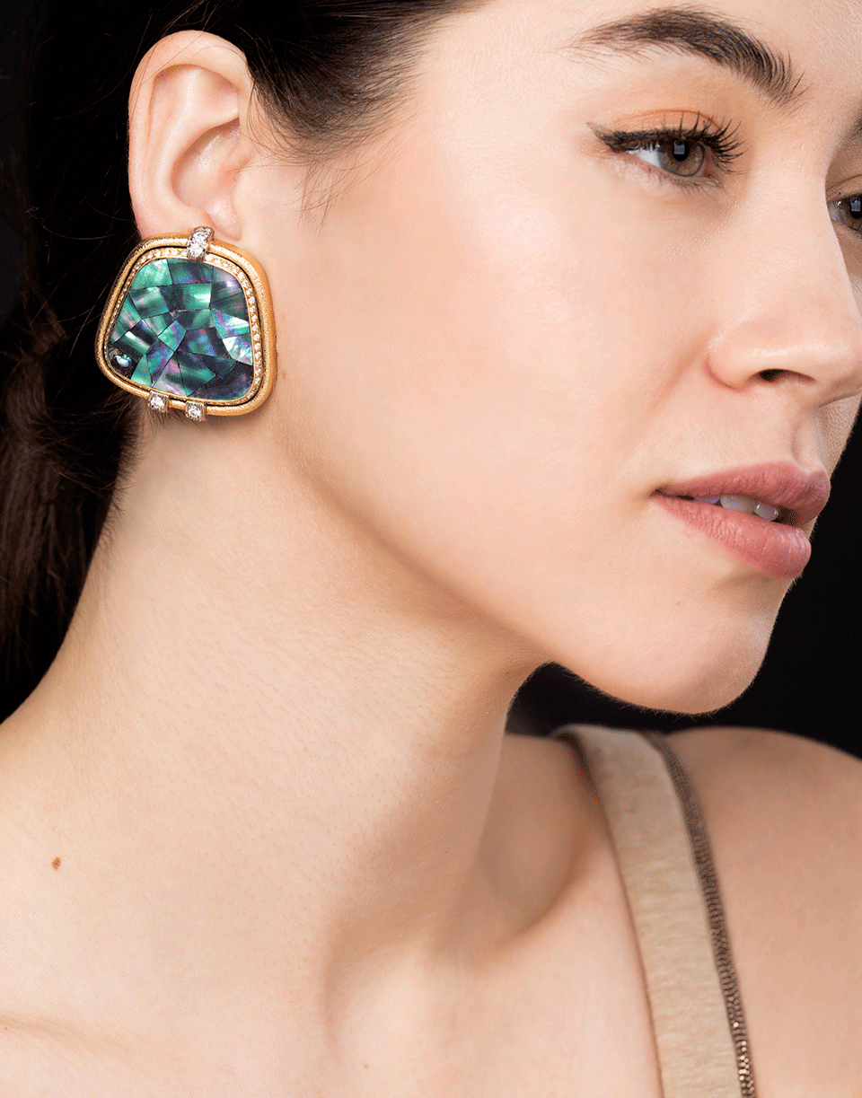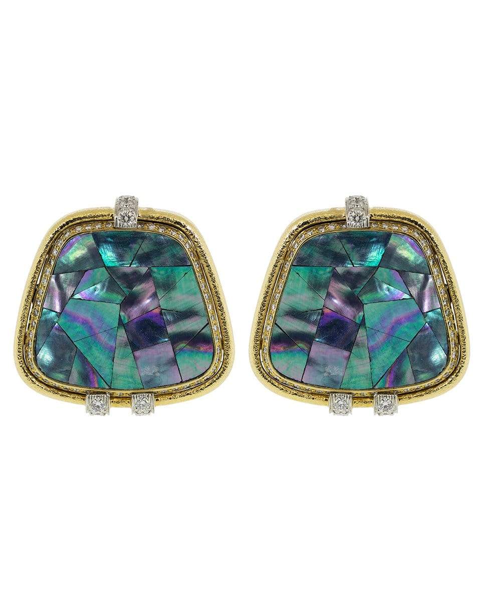 David Webb abalone shell clip on earrings with brilliant cut diamonds and hammered gold.