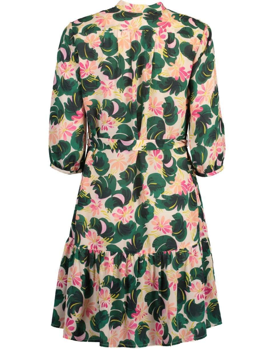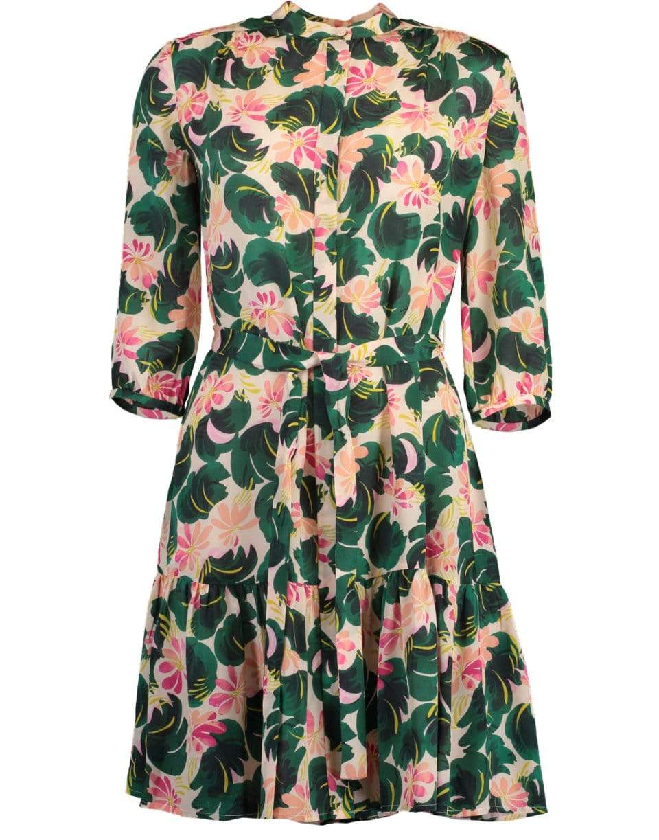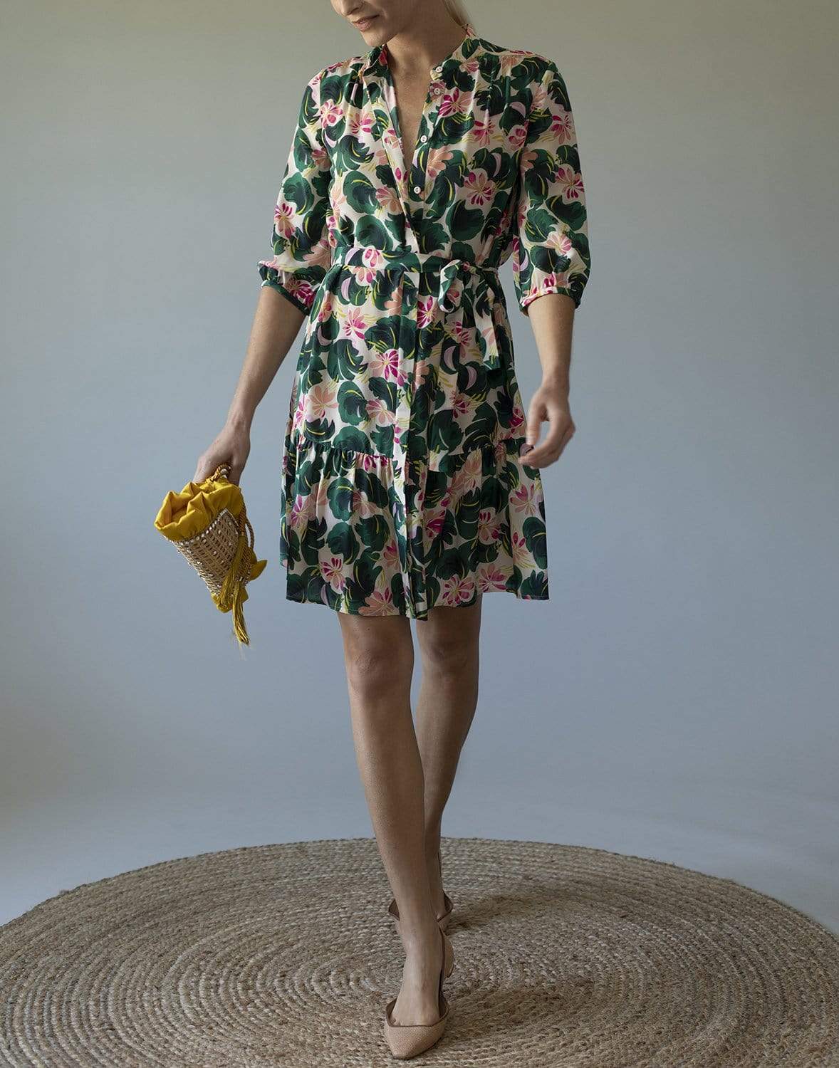 Saloni tyra dress in cream lily features an adjustable tie waist belt, spread collar, flared skirt, three-quarter sleeves, and concealed front button fastenings.