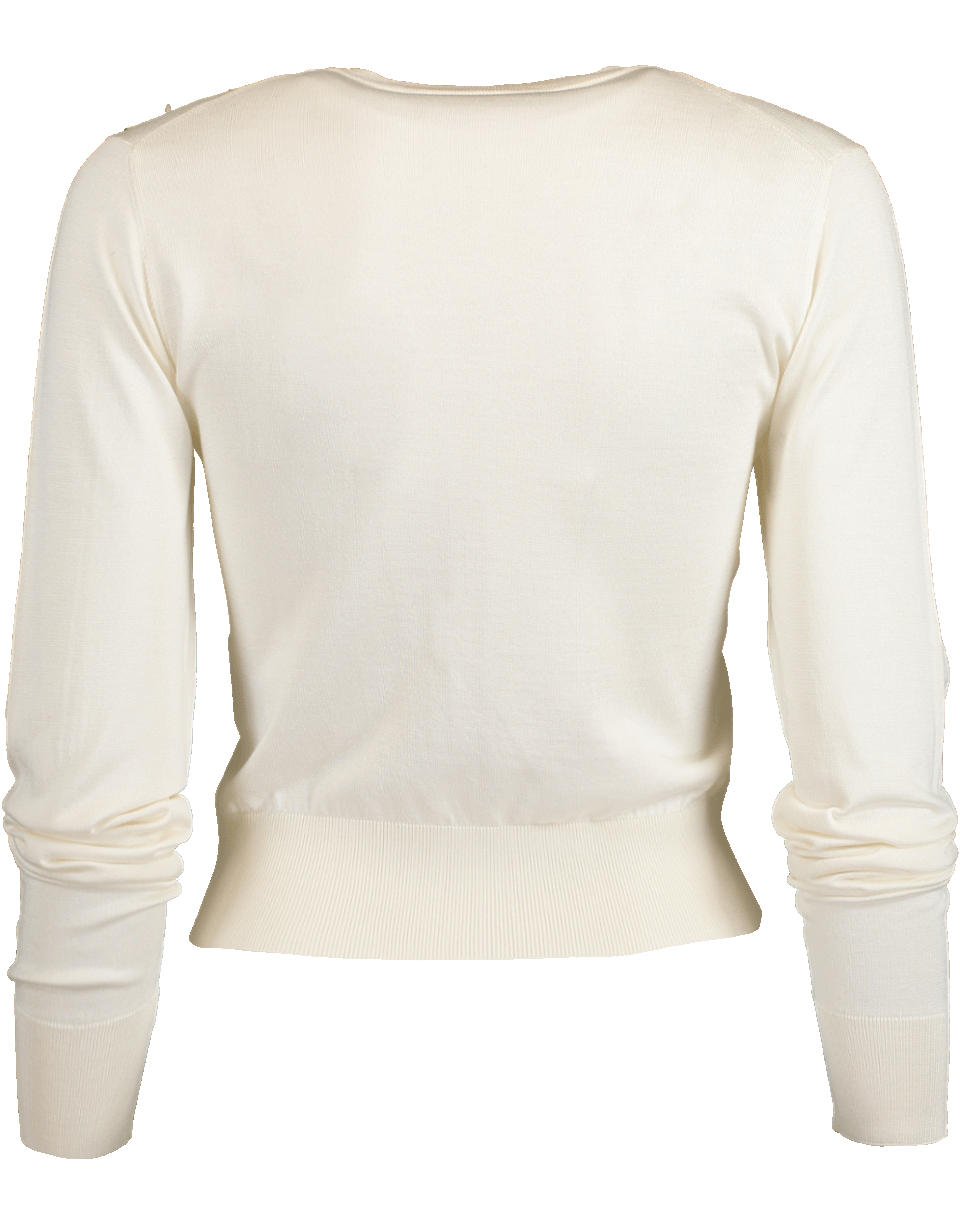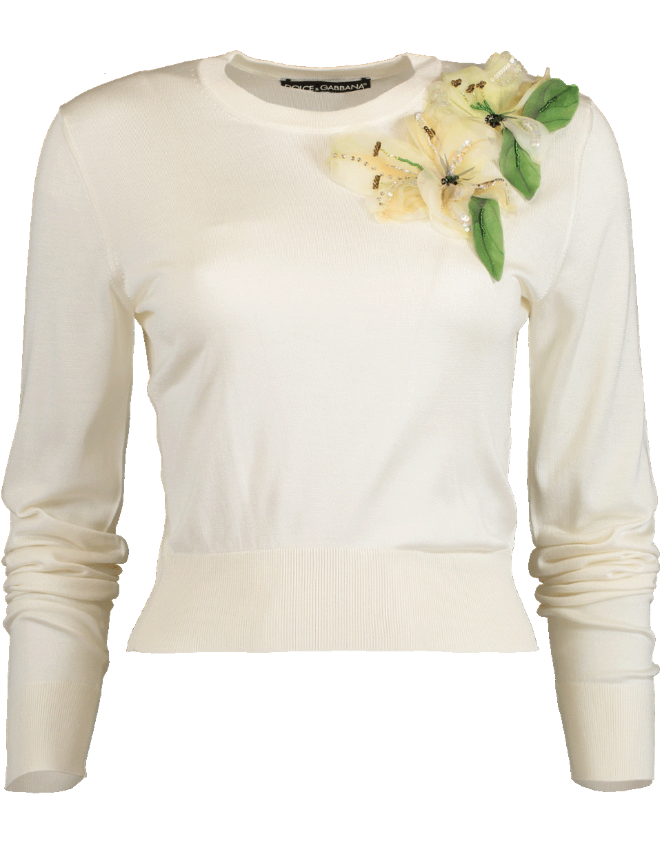 This sophisticated silk pullover sweater from Dolce & Gabbana features long sleeves, a crewneck, slim fit, rib trims and delicate handcrafted organza flower embellishments.