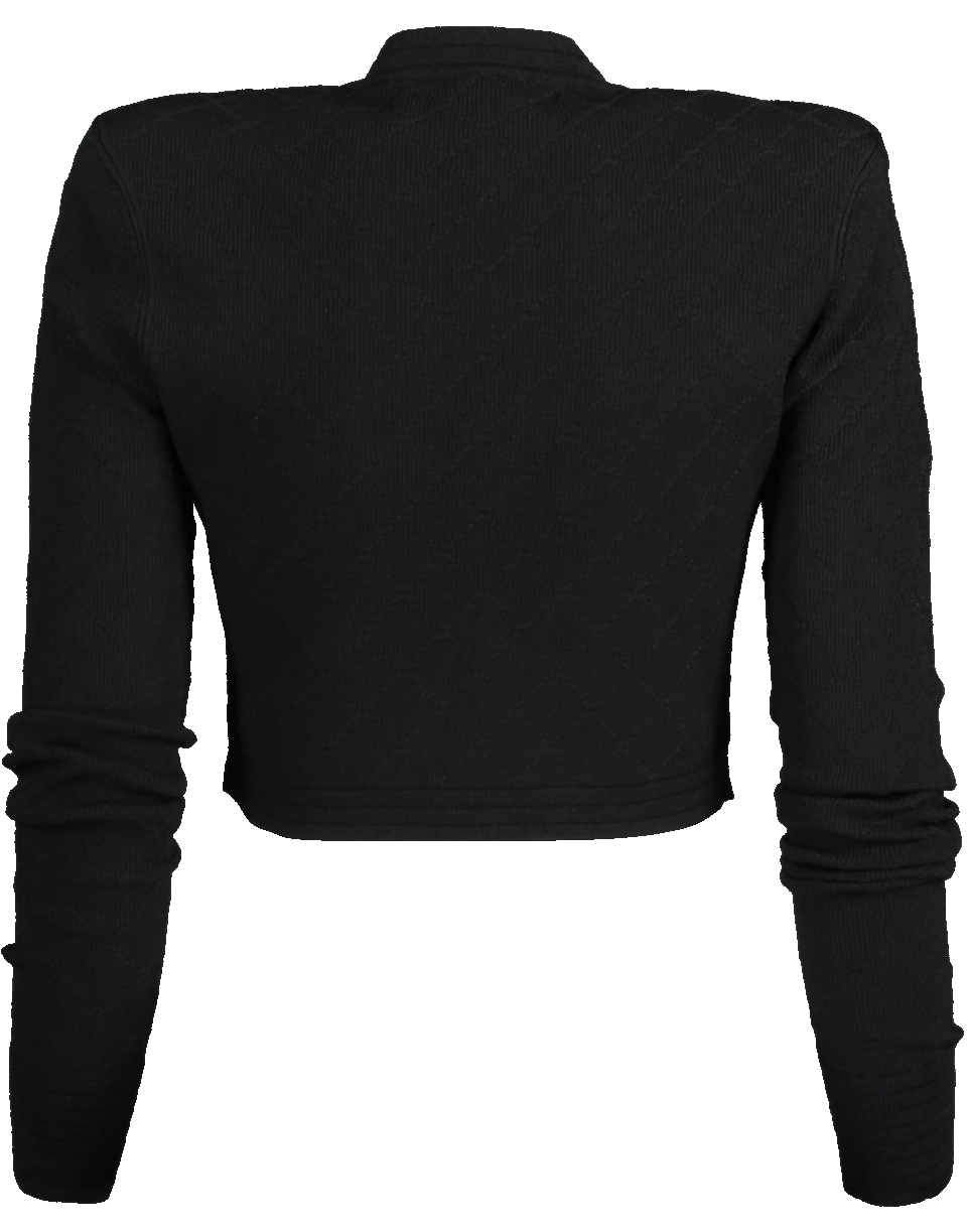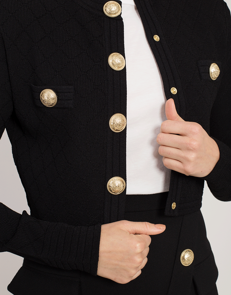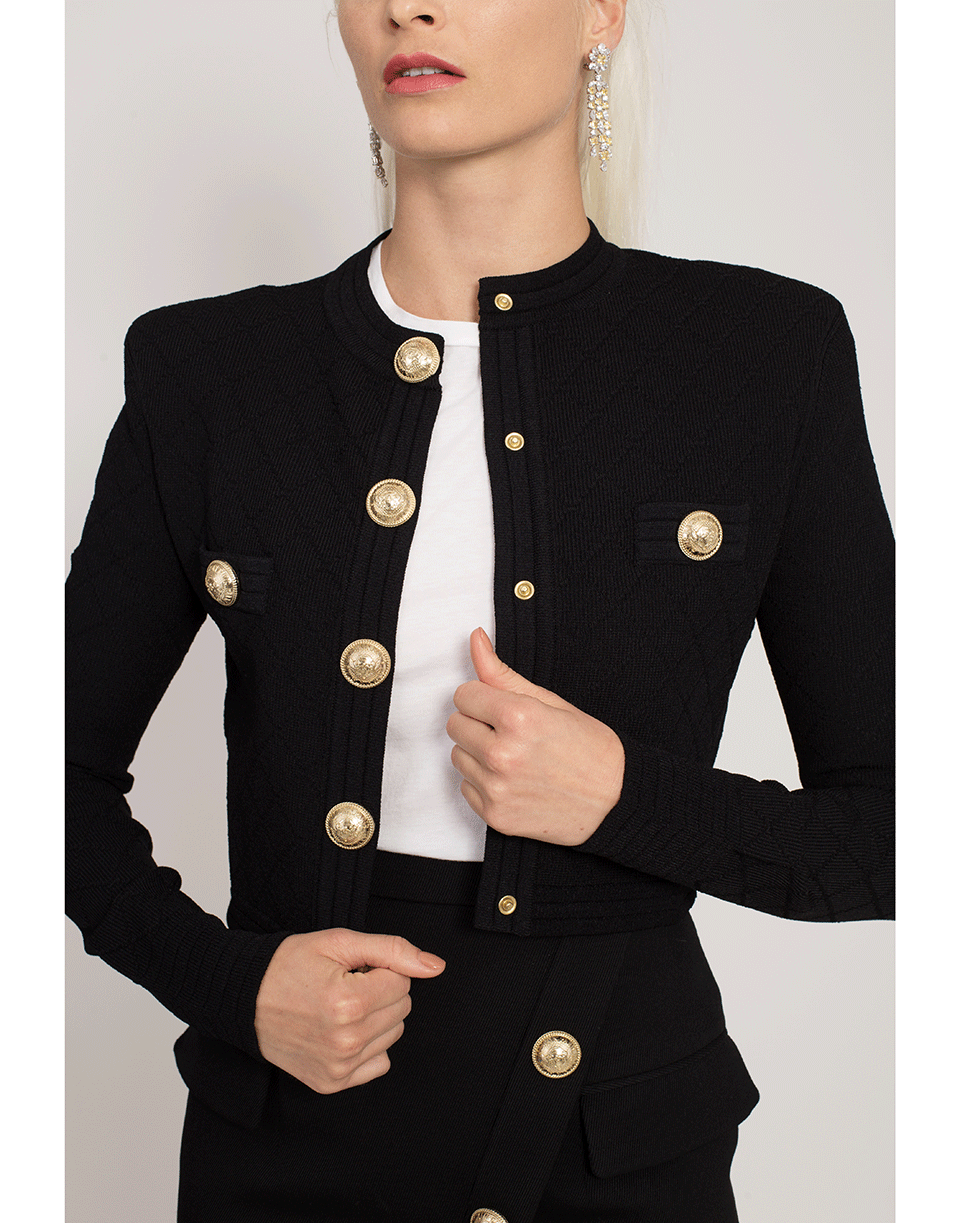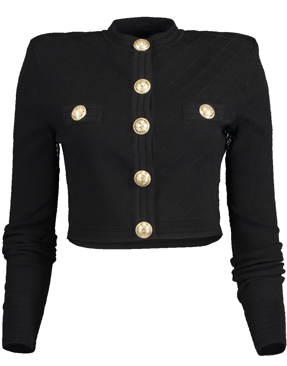 This cropped jacket from Balmain features a button front with five exposed goldtone snap buttons, two chest pockets, a round neckline, long sleeves, diamond quilting on one half and a ultra flattering structured fit.