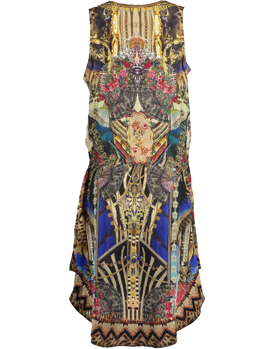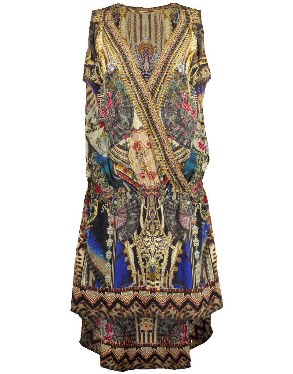 Camilla’s Stronger Together cross over front dress screams luxury. This silk wrap dress features a sleeveless, relaxed silhouette, a deep v-neckline with a crossover detail, a high low hem, and an elastic waistband.
