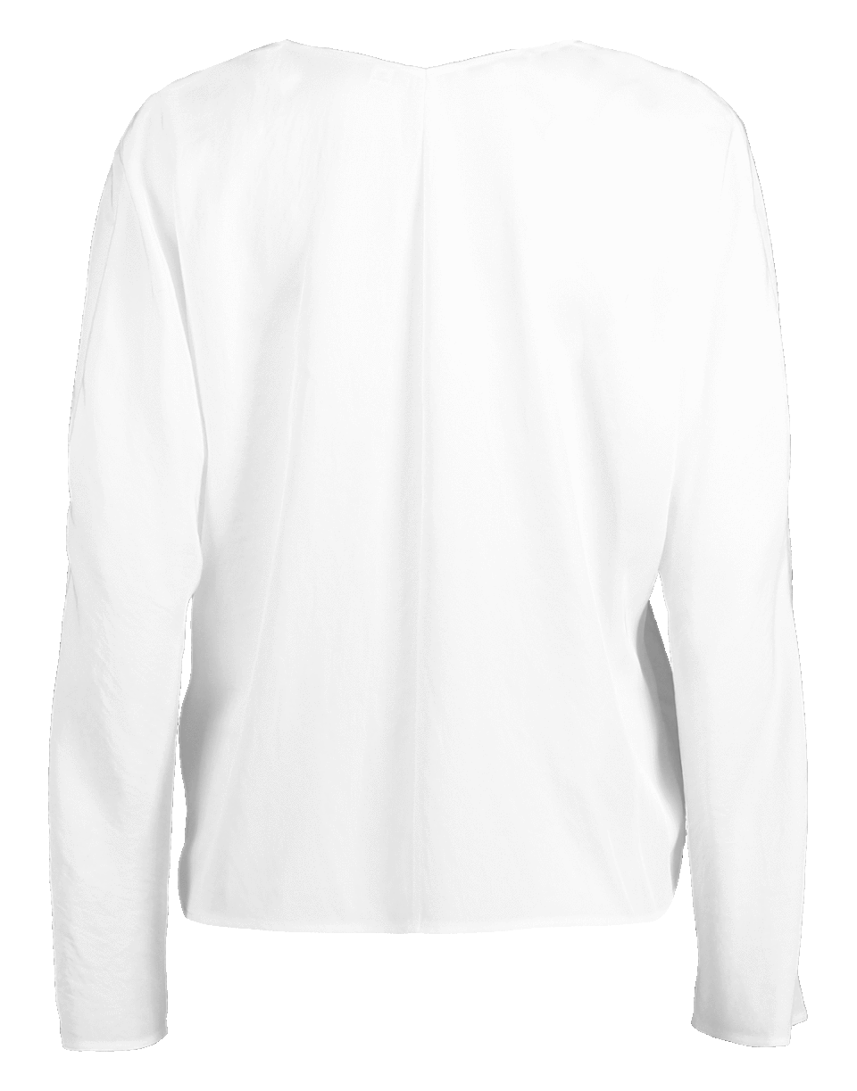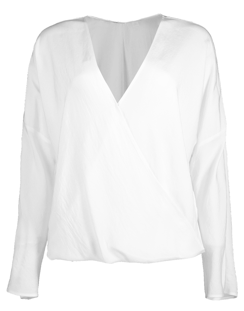 Crossover blouse by Vince. This white slipover blouse features Japanese satin with a crinkled finish, long sleeves, v-neckline, faux wrap front and a relaxed fit.