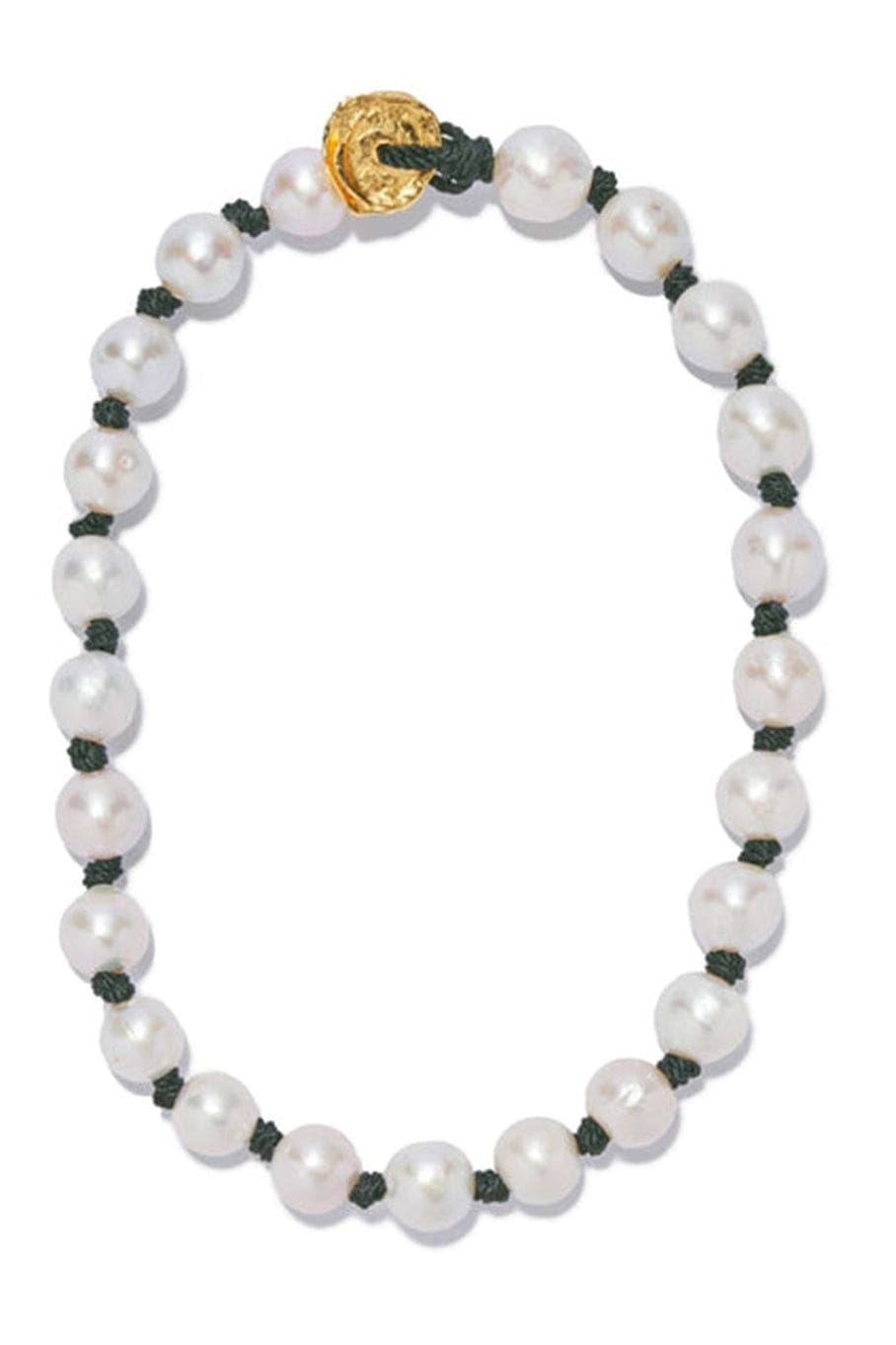Lizzie Fortunato cruz necklace. Freshwater pearl and hand-knotted black cord necklace with gold-plated "flake" toggle clsure.