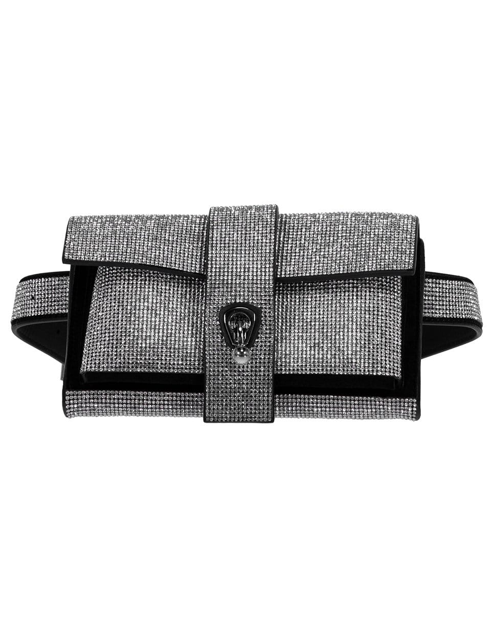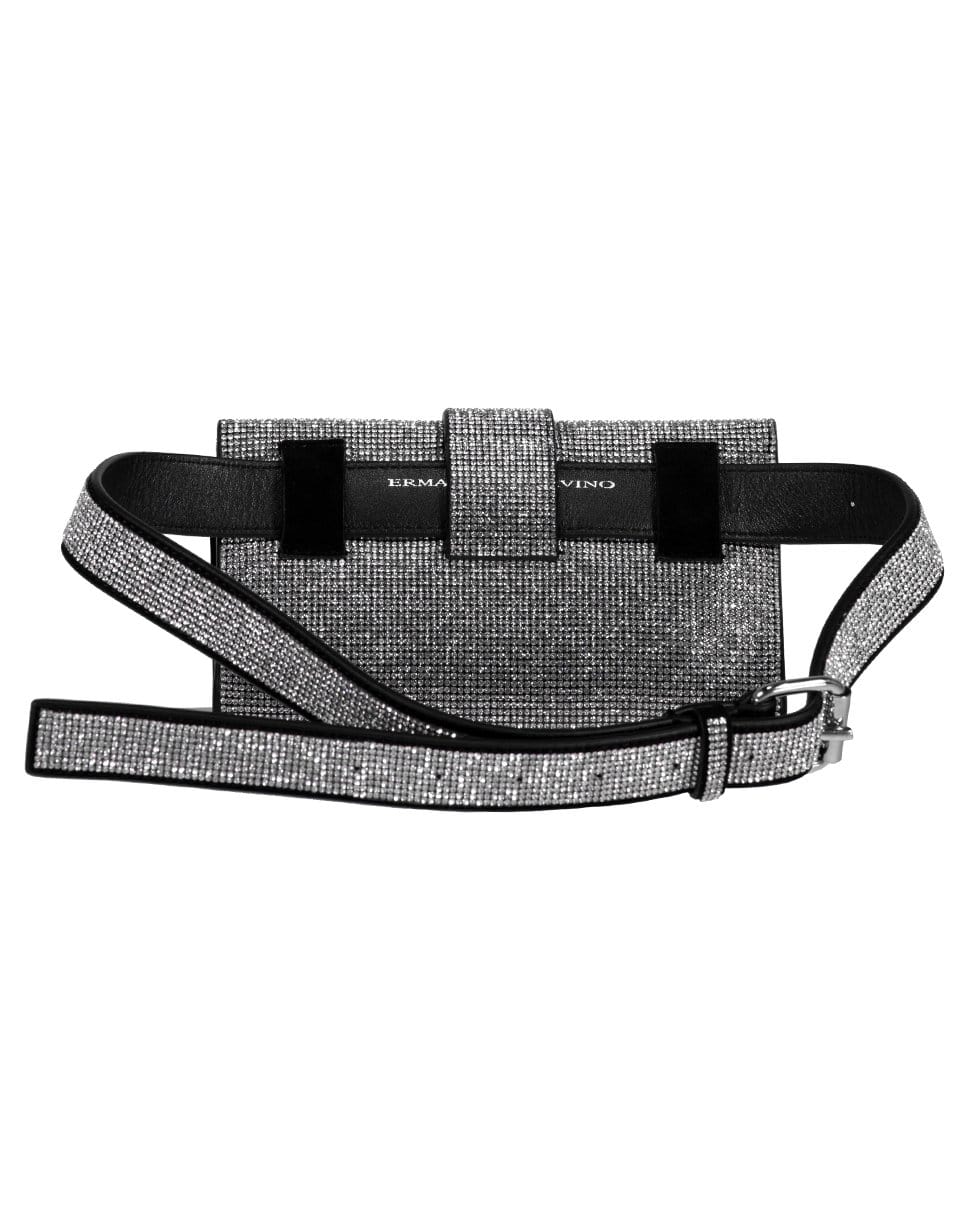 Ermanno Scervino leather crystal belt bag featuring crystal accents, a detachable bag with two interior compartments, and a removeable chain strap.