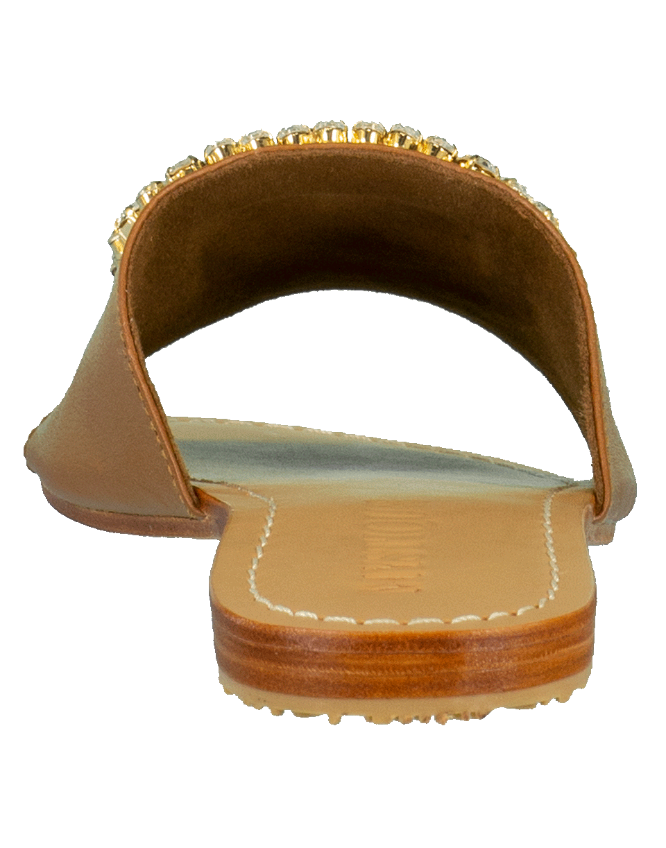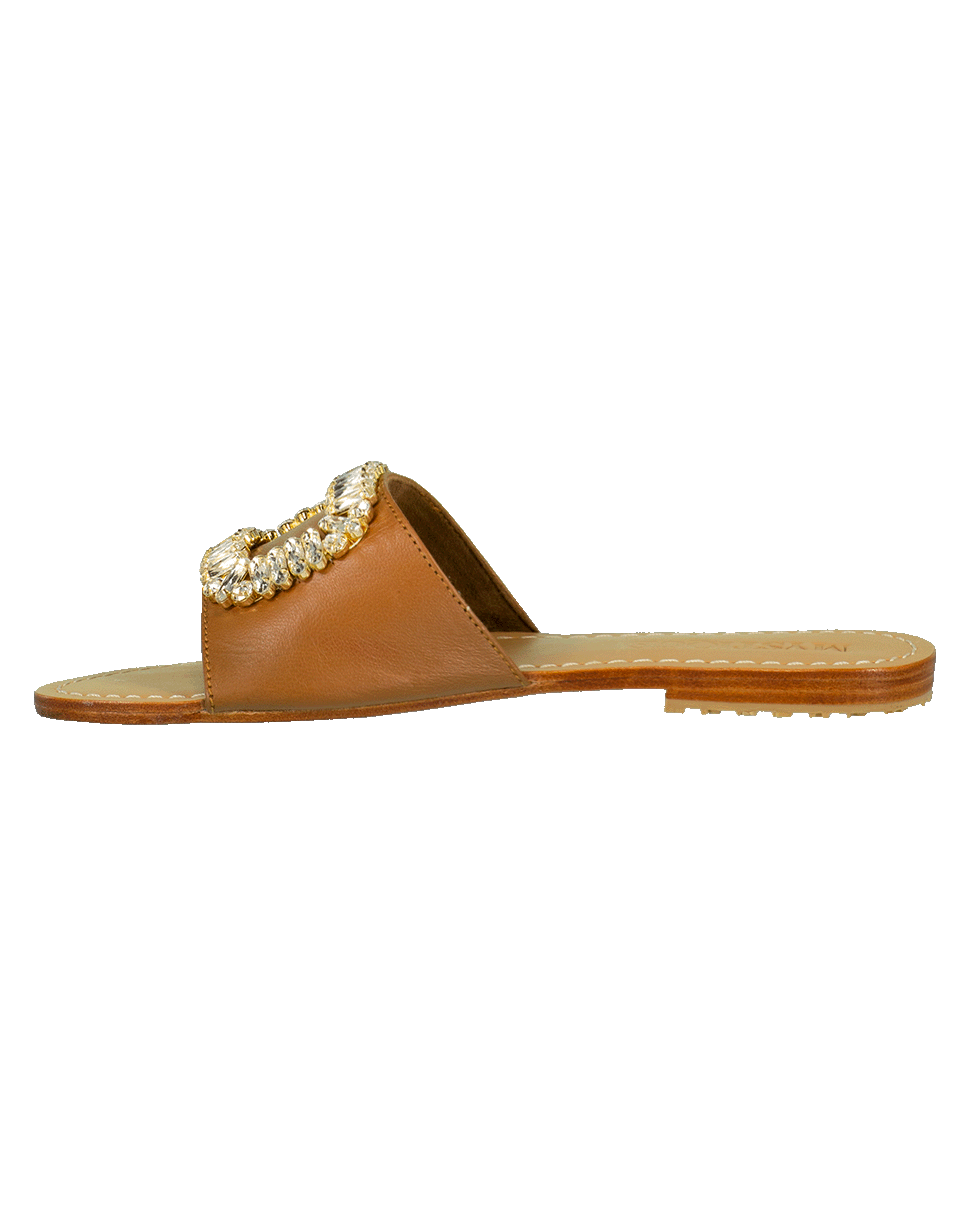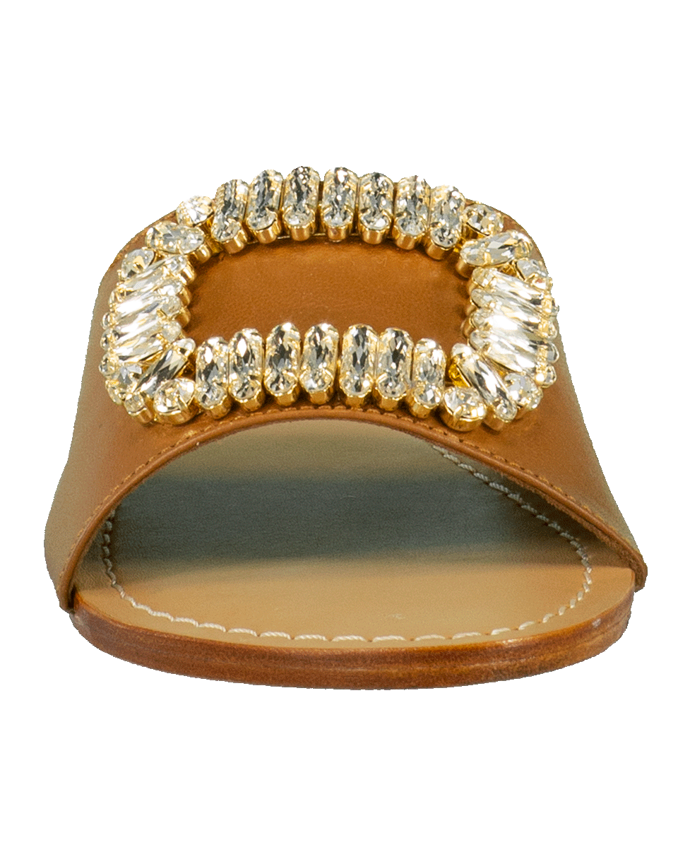 Crystal square buckle slide by Mystique. This leather flat slide features an open toe slip on style with a crystal embellished upper. All leather.