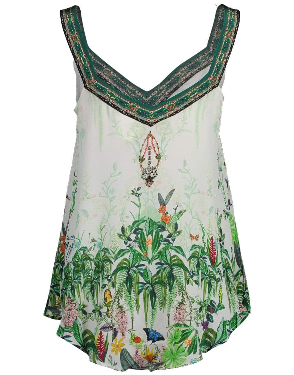 Daintree Darling V-Neck Strap Top from Camilla featuring a 70's boho inspired silhouette with a relaxed fit, wide straps, and hand finished crystal embellishments along the neckline.