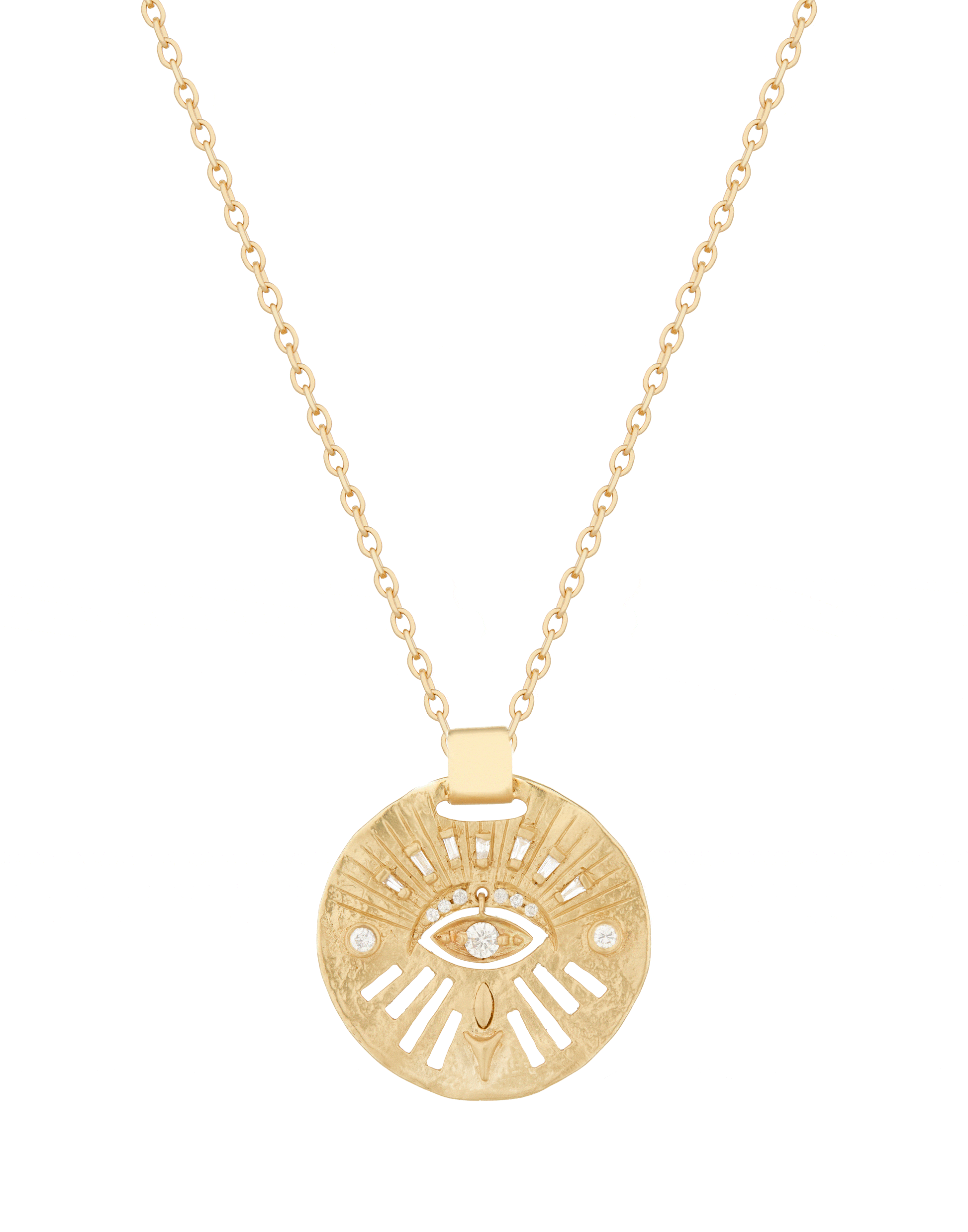 Celine Daoust Dangling Eye Necklace, light yellow gold medal with diamonds. The Anja Eye is the one of the most important symbols in Hinduism. Often surrounded by rays of sunlight, the Anja Eye represents the eye of divine wisdom that seeks to see and know universal truths. Diamond is the strongest stone known to man, composed of pure carbon n a perfect atomic pattern. Is is an emblem of purity, eternity, and invincible spiritual power.