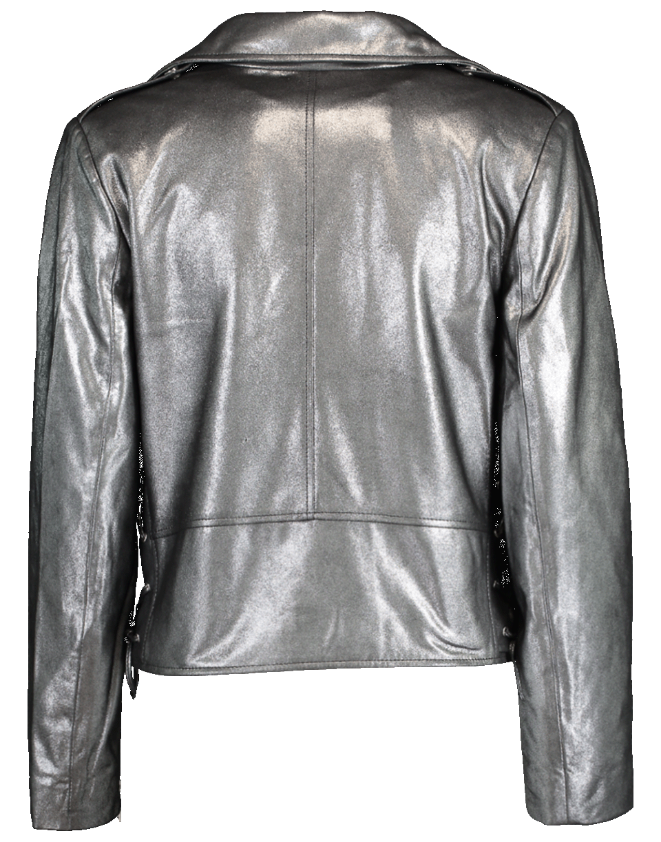 Metallic cropped jacket from Nour Hammour featuring long sleeves, a spread collar, asymmetrical front zip, slim fit, two front zipped pockets, buckle front, zipped cuffs, and lace up detail on each side.