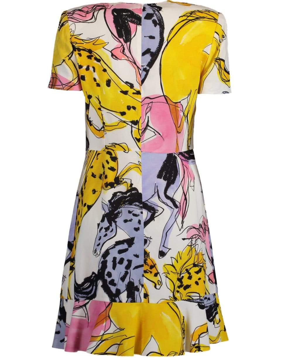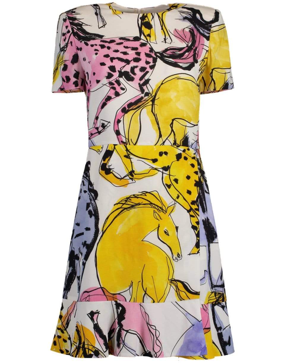 Stella McCartney Dariana print dress with a slim waist, short sleeves, round neckline, flounce silhouette, side pockets, concealed back zip closure, and a short length.
