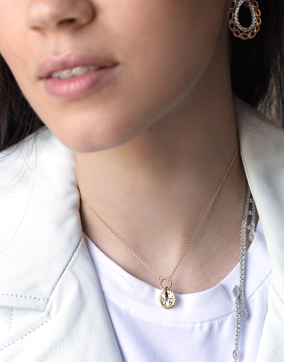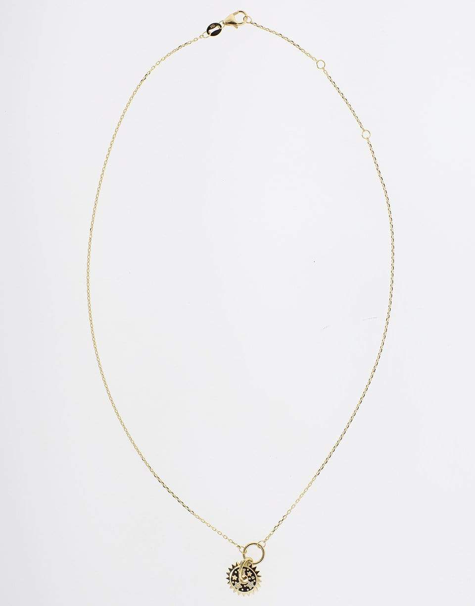 Foundrae dark blossoms disk necklace with enamel. Resilience. Wild, abundant and untamed, the blossoms are fed with passion and continue to bloom, even in darkness, against adversity. But we can’t separate the flower from its thorn.