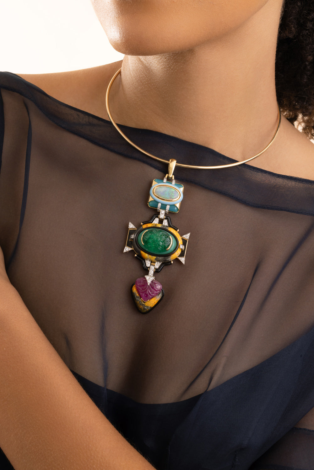 Blue Agate, Opal, Bumble Bee Jasper, Chrysoprase, Emerald, Ruby, Diamonds
