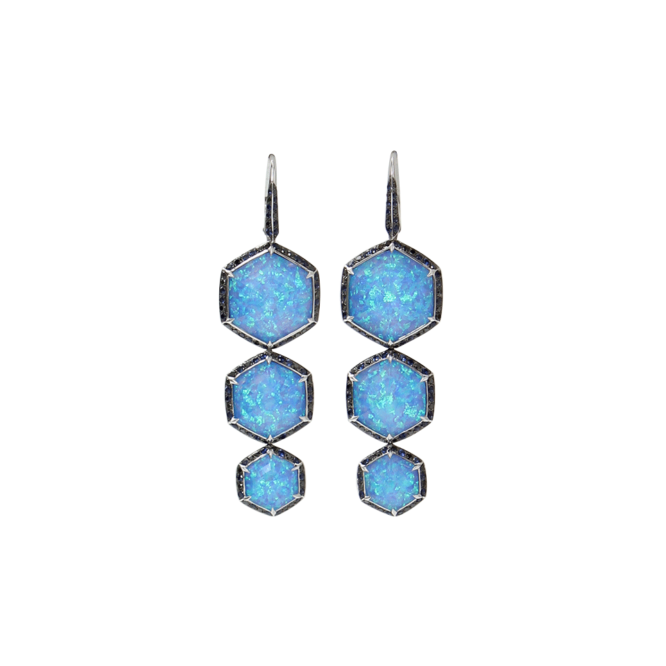 Deco haze long drop earrings with black opalescent, quartz crystal haze, and blue sapphire and black diamond pave from Stephen Webster. For pierced ears.