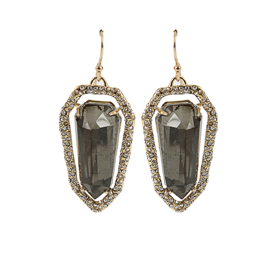 Inspired by 1930's art deco architecture, these Delano long shield earrings by Alexis Bittar are reminiscent of the Chrysler building. With 10K gold tone and high shine rhodium settings that suspend custom cut hematite and pyrite doublets, these earrings are truly sensational.
