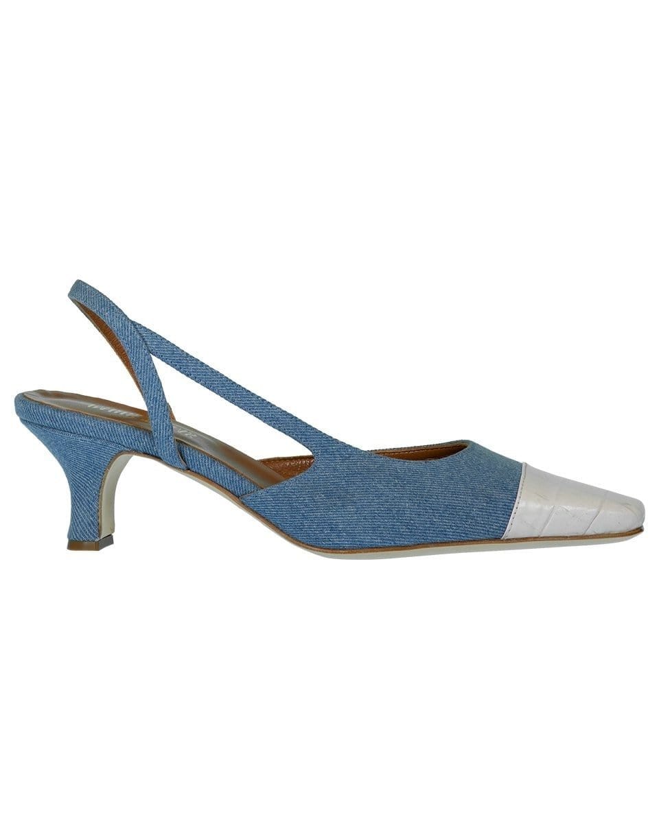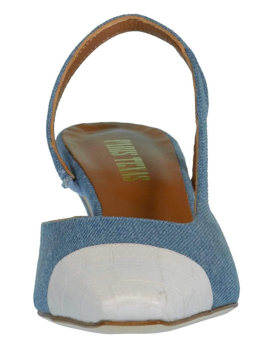 Paris Texas denim moc-croco slingback with contrasting croco toe-cap, fitted slingback ankle strap, and a mid-heel.