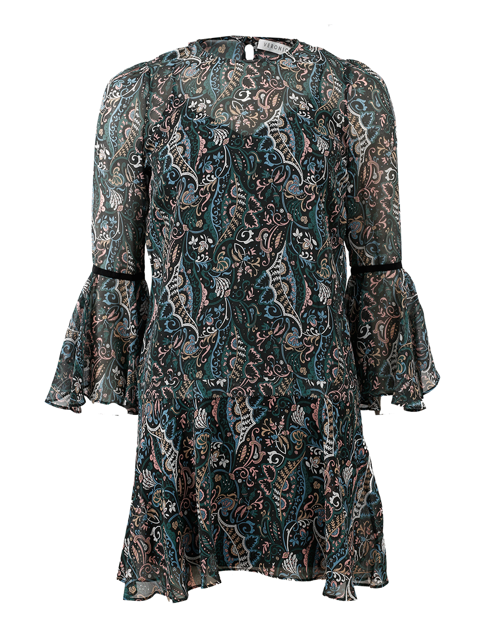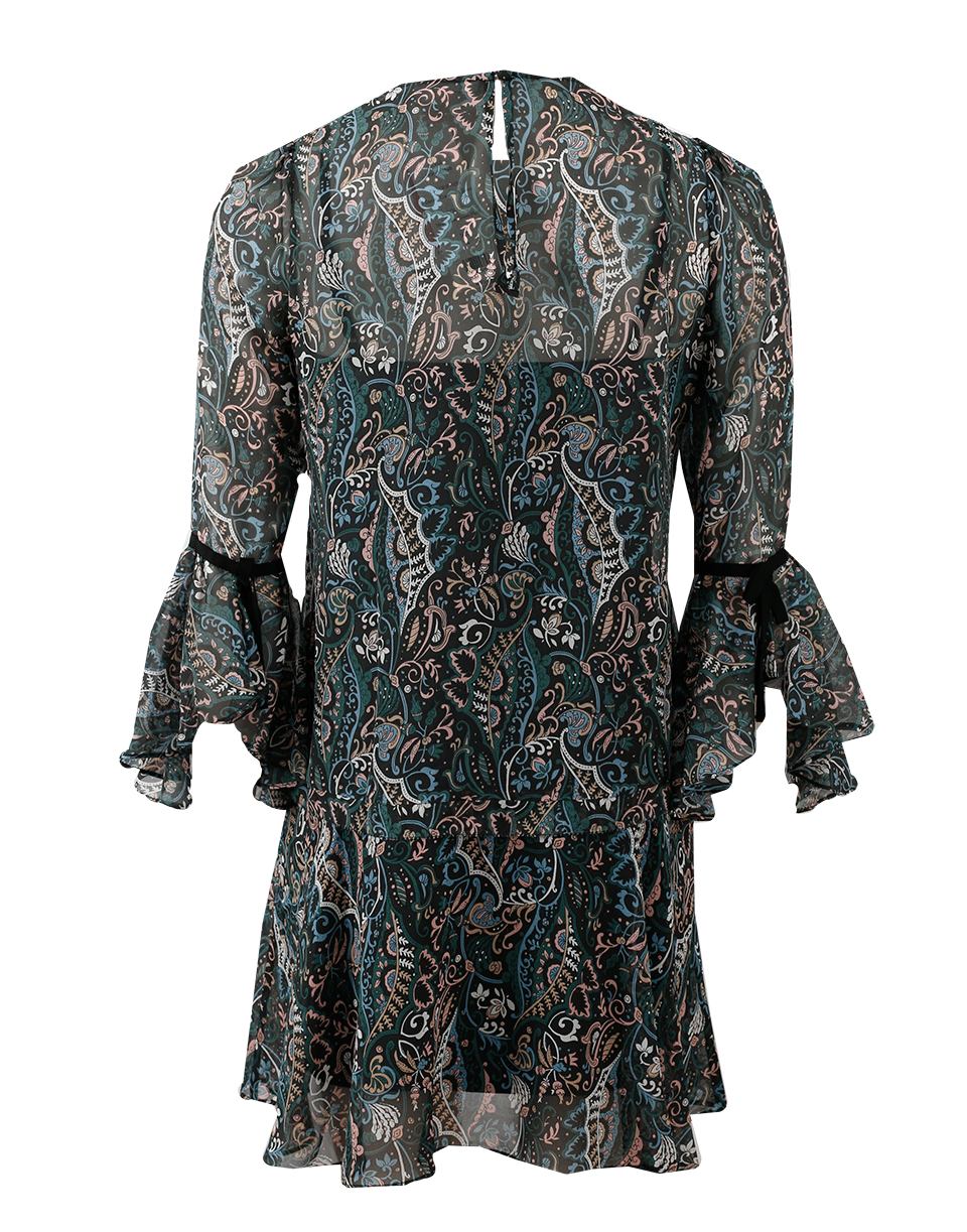 Crew Neckline With Keyhole And Button Closure, Long Circular Flounce Sleeves