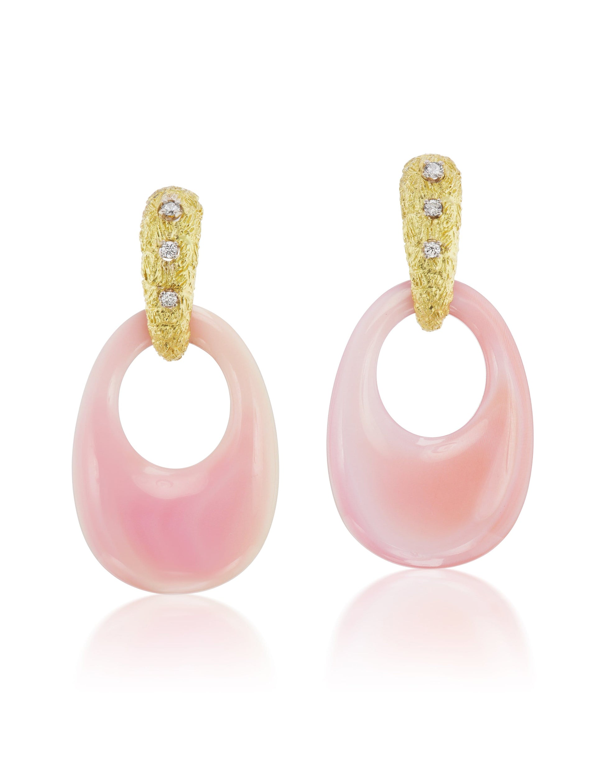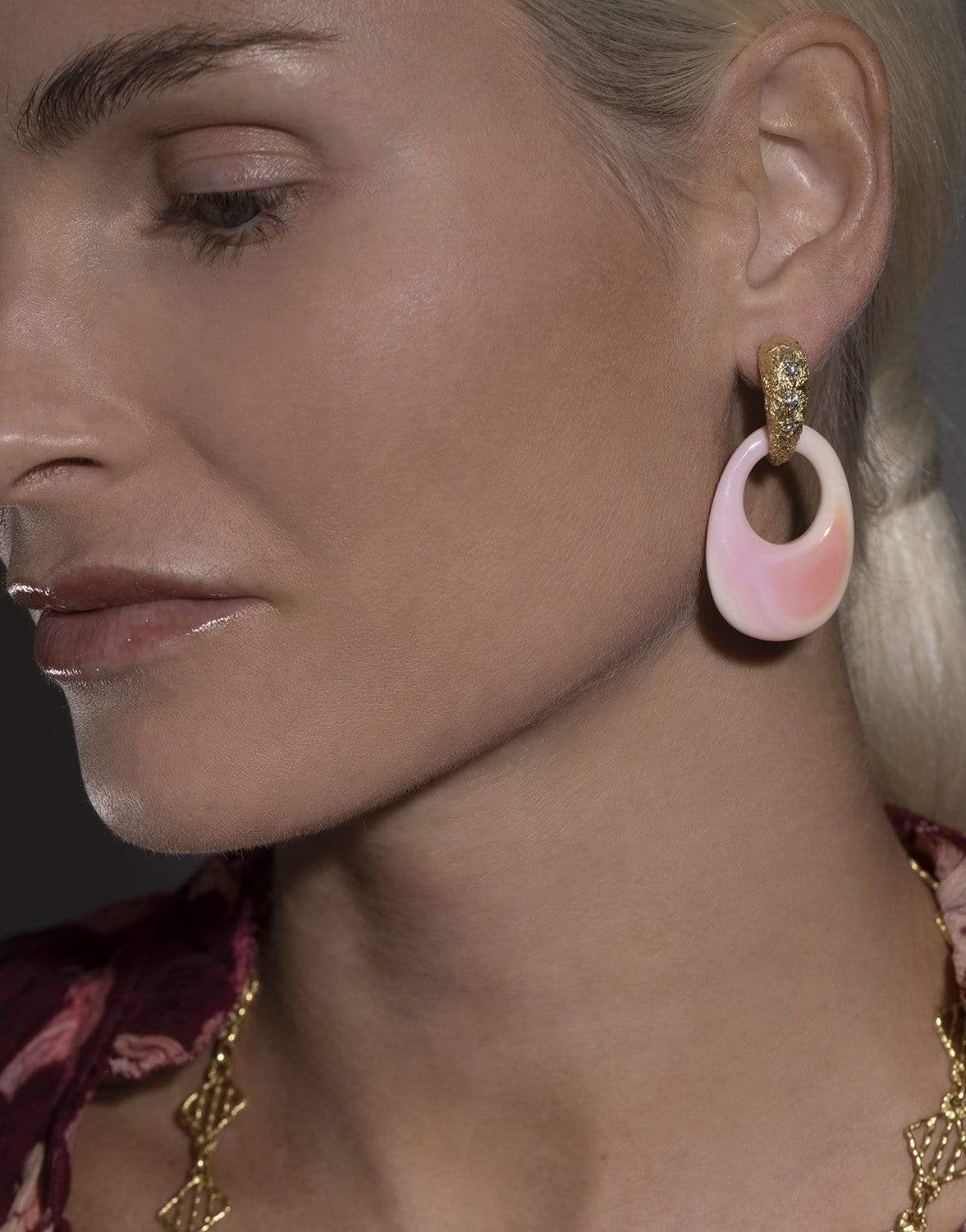 Jenna Blake interchangeable stone hoop earrings with coral and diamonds.