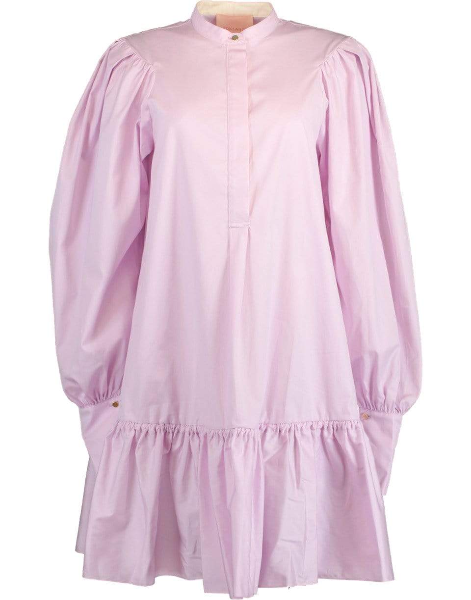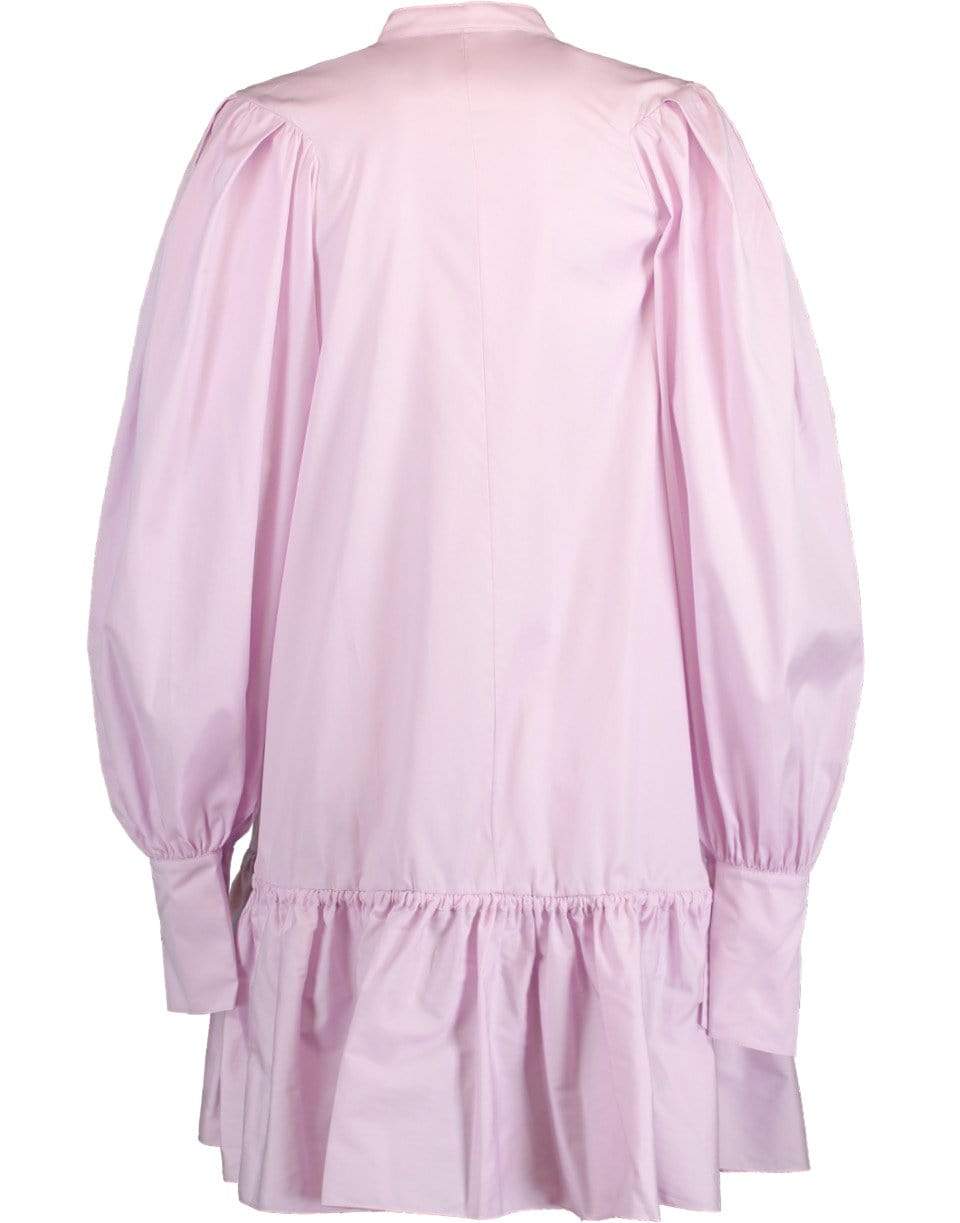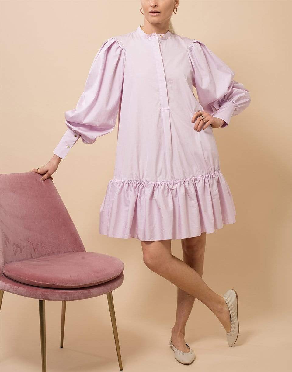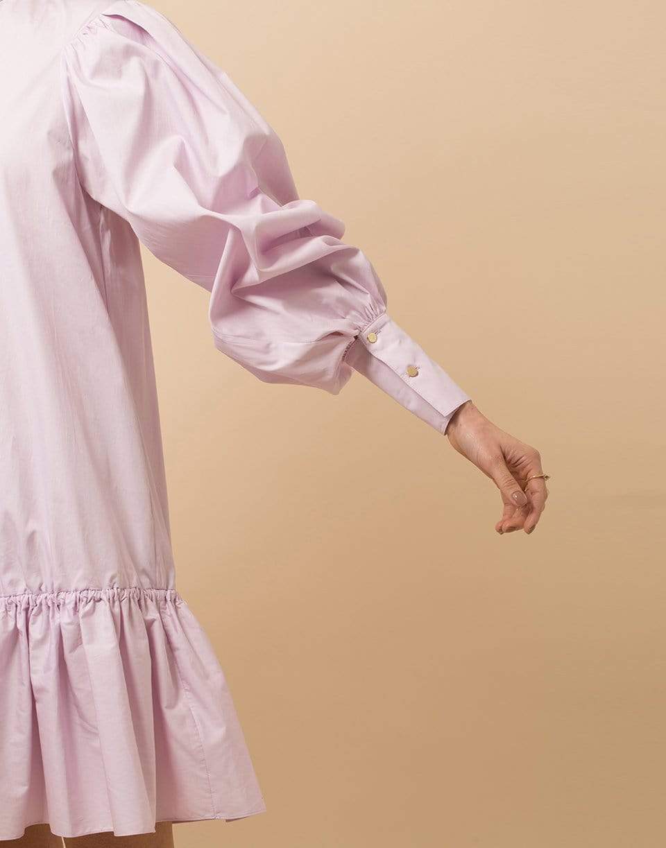 Lilac cotton poplin Deva dress from Roksanda featuring a relaxed fit, round collarless neckline, concealed half button placket at front, long balloon sleeves with buttoned cuffs, pleated hem, and a knee length.