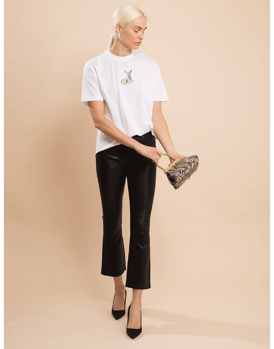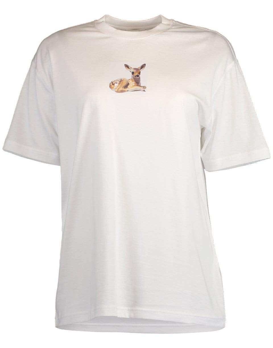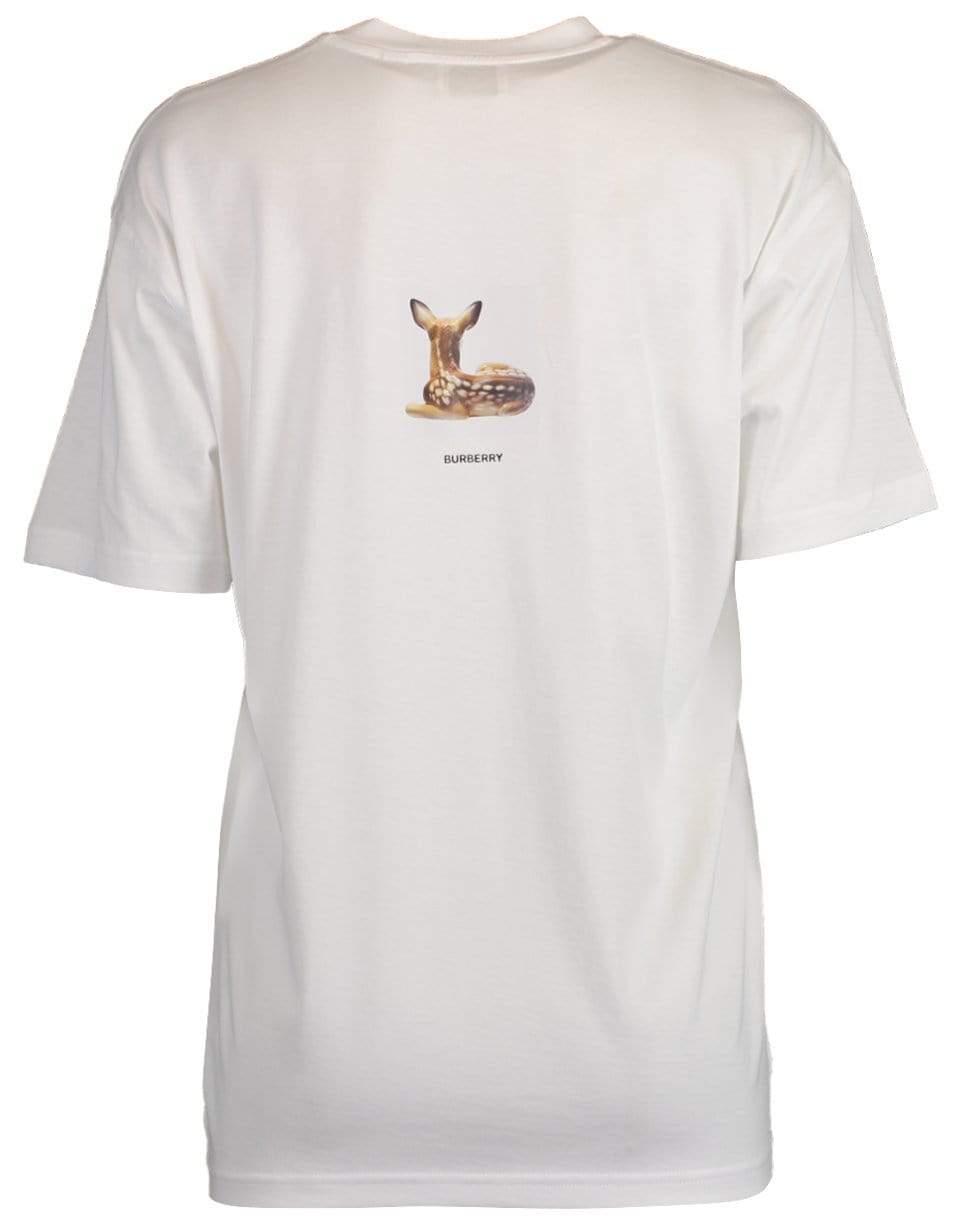 The Devon Bambi t-shirt from Burberry featuring a relaxed fit with a crewneck, short sleeves, pullover design, and an adorable printed fawn on front and back.
