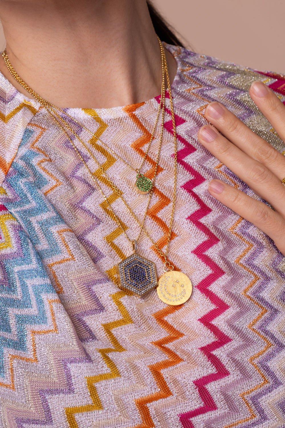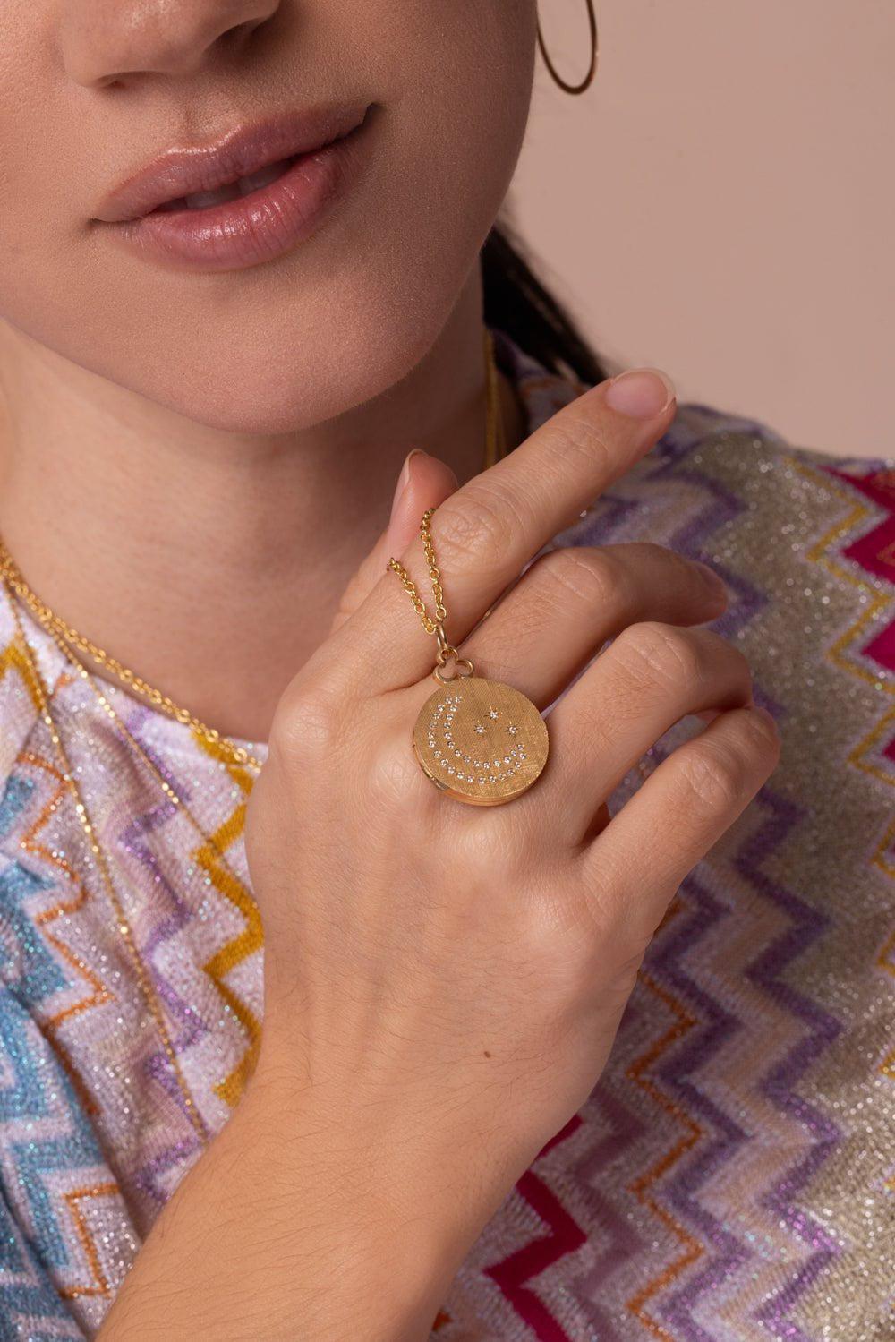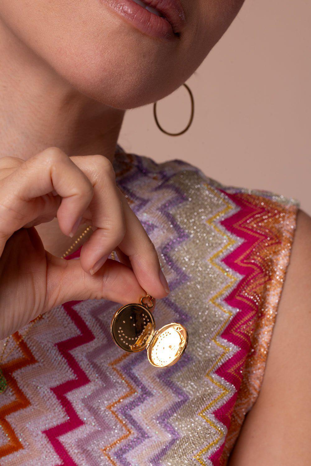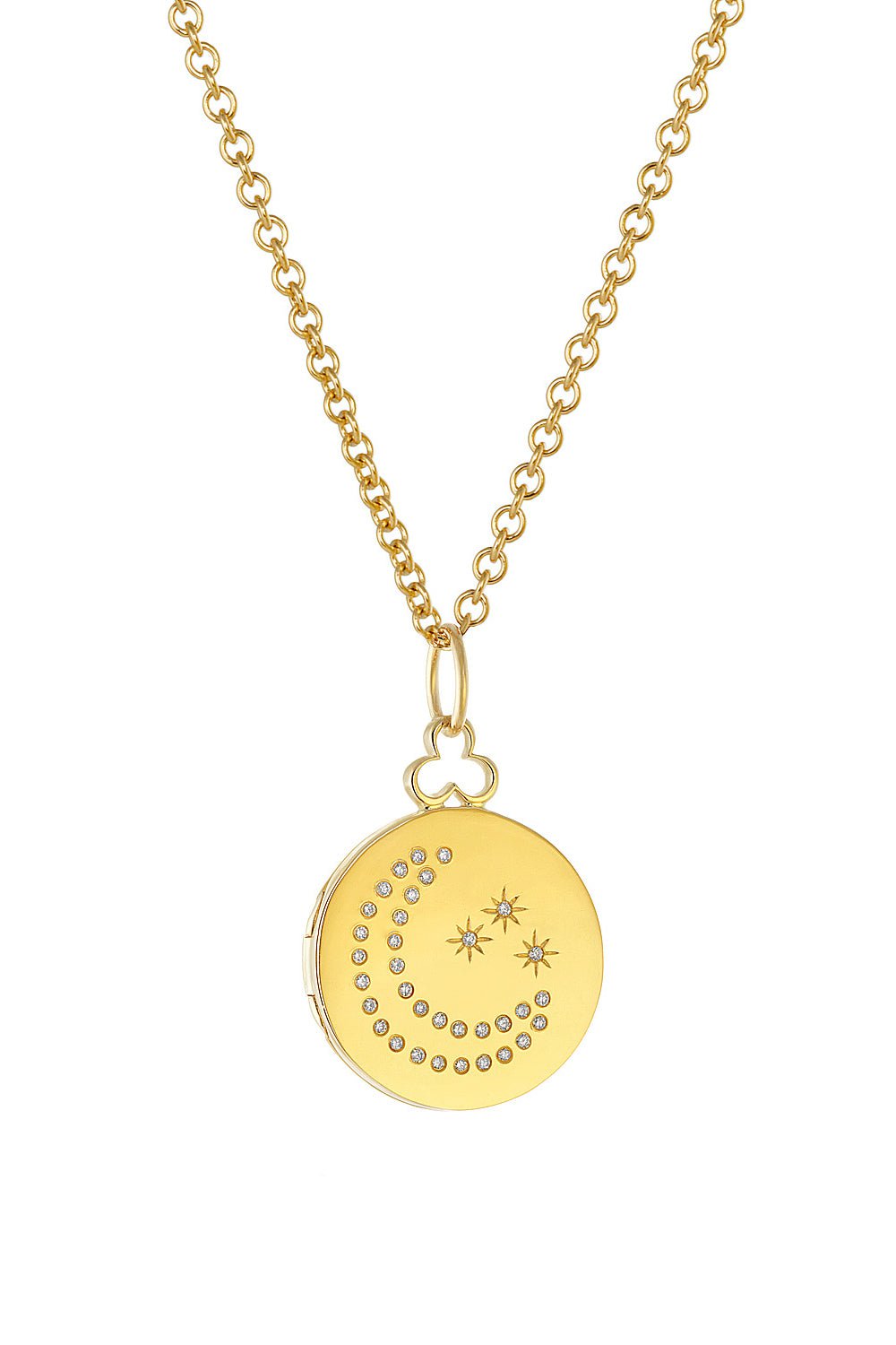 Devon Woodhill medium moon and starts locket necklace in yellow gold.