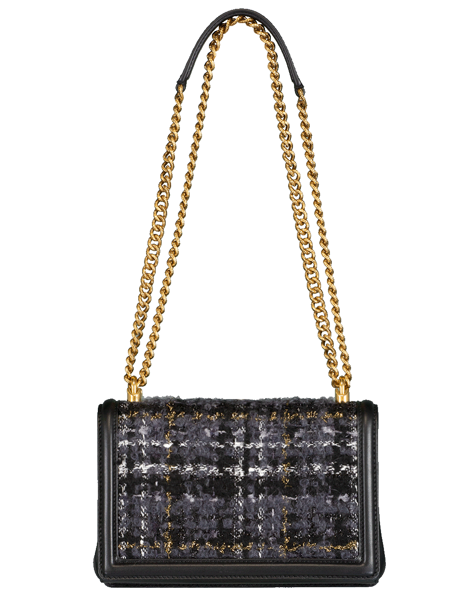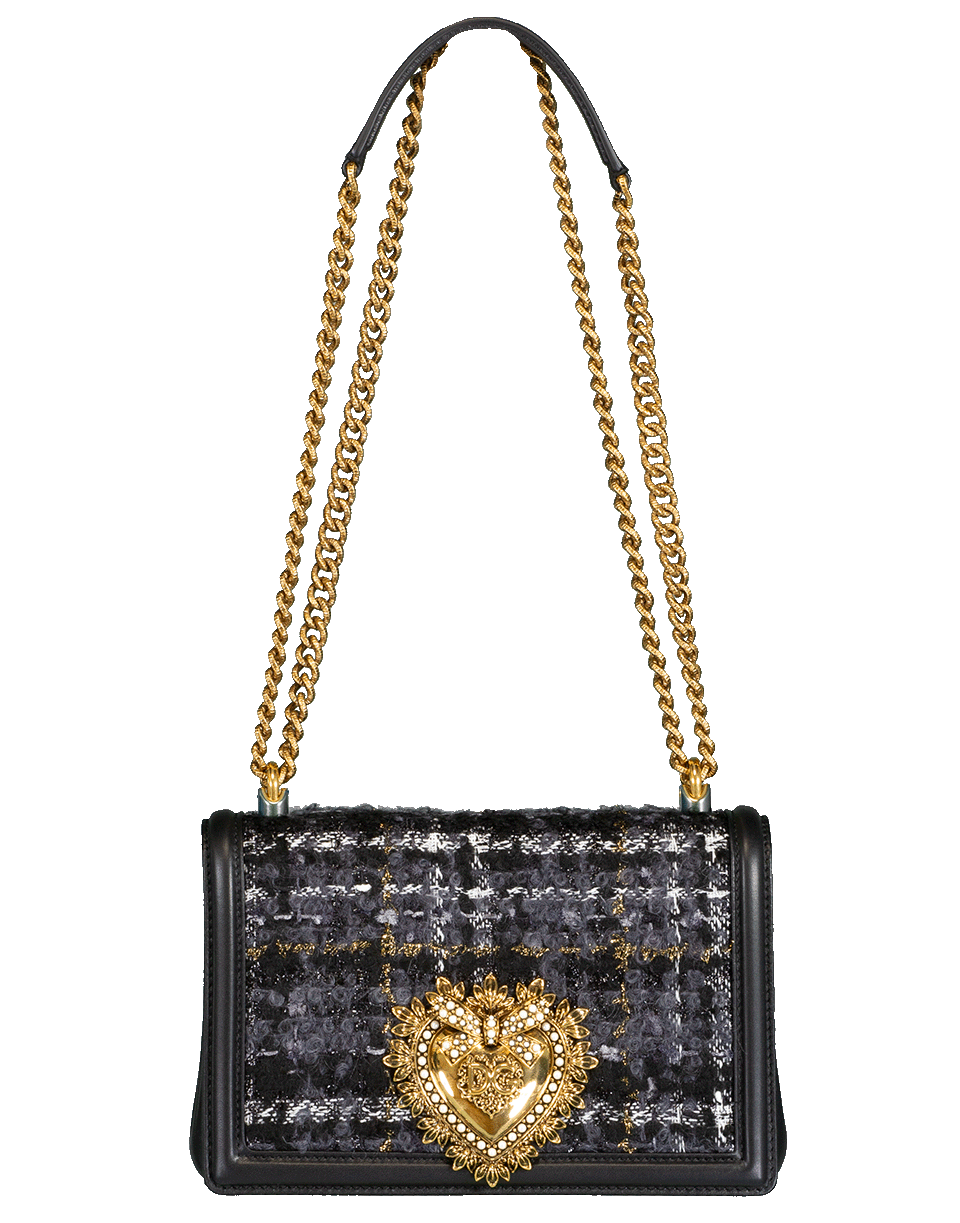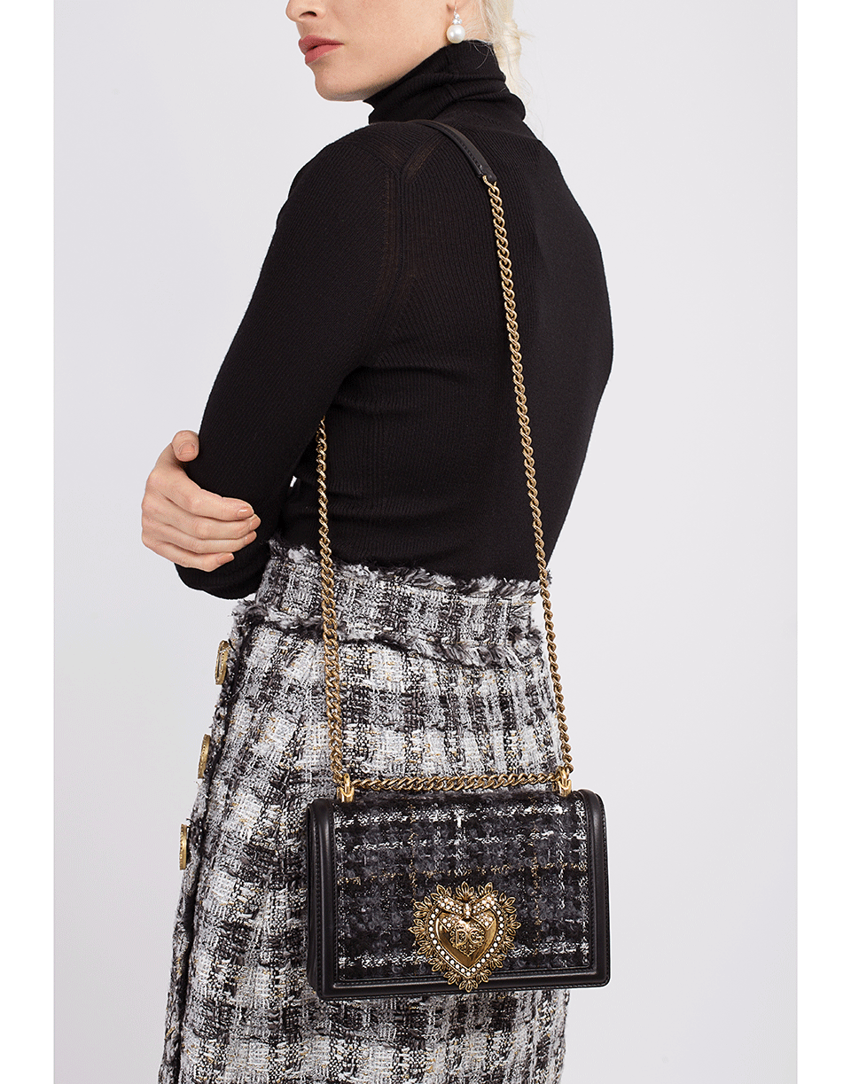 Tweed and leather crossbody bag from Dolce & Gabbana featuring a flap top with the iconic sacred heart logo, gold tone hardware, interior zip pocket and a hidden slip pocket.