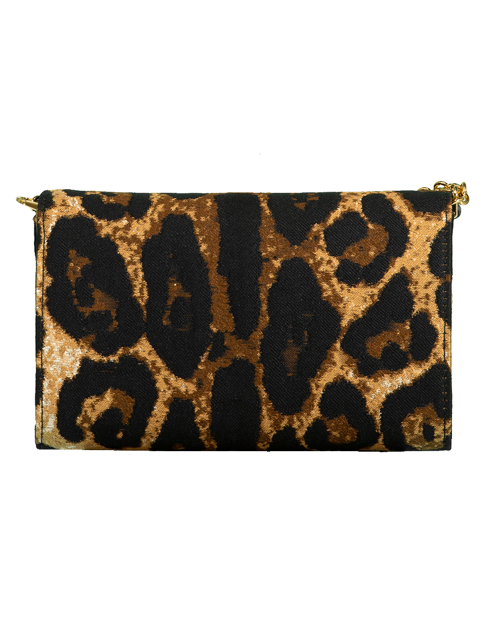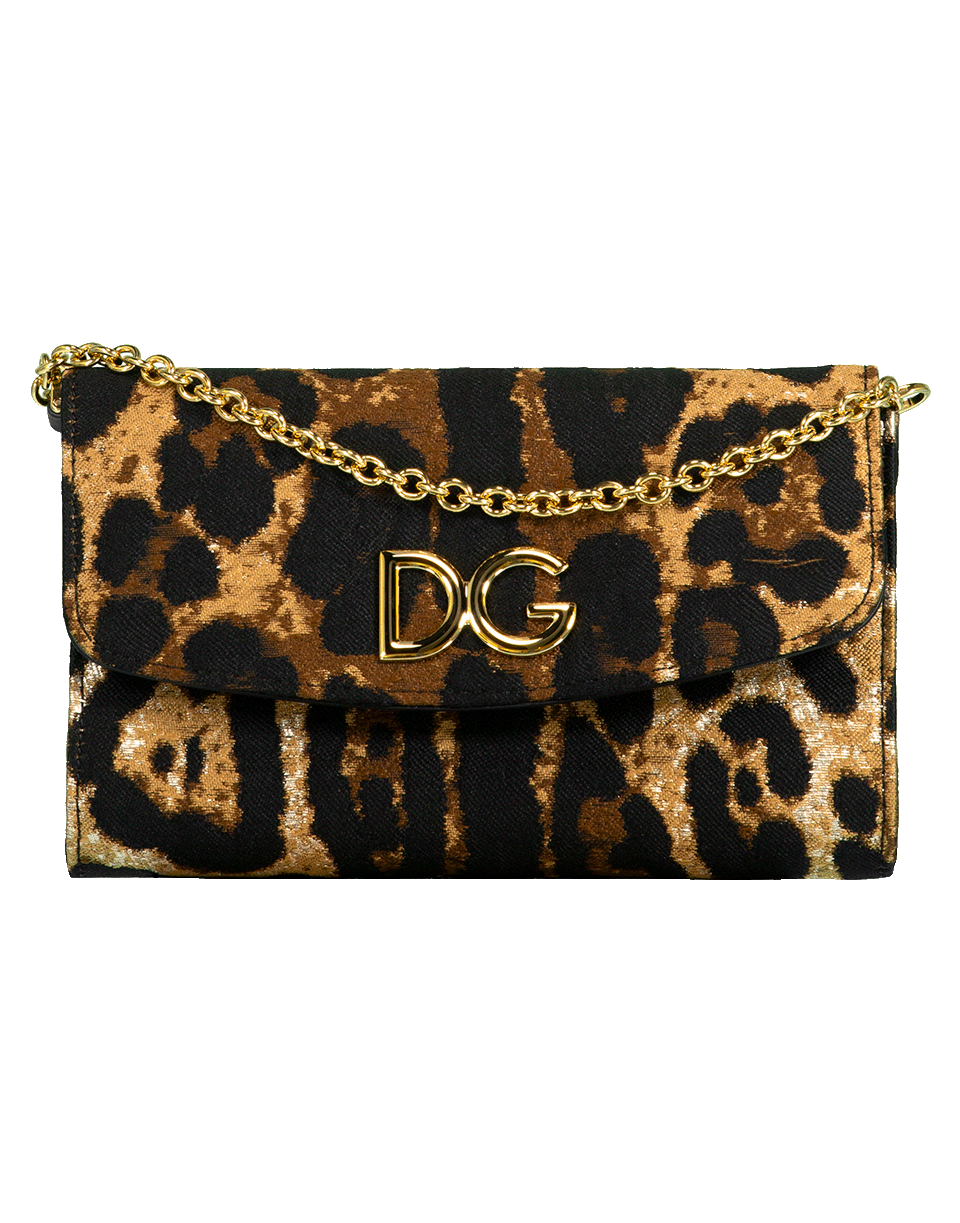 Leopard DG Girl clutch from Dolce & Gabbana featuring the label's signature leopard print, chain shoulder strap, a foldover top with snap closure, internal slip and zip pockets, and a gold-tone logo plaque on the front.