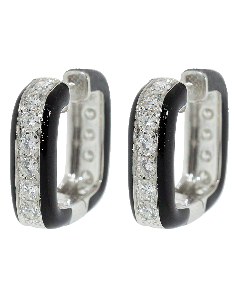 Black enamel square hoop earrings with diamonds designed by Graziela.
