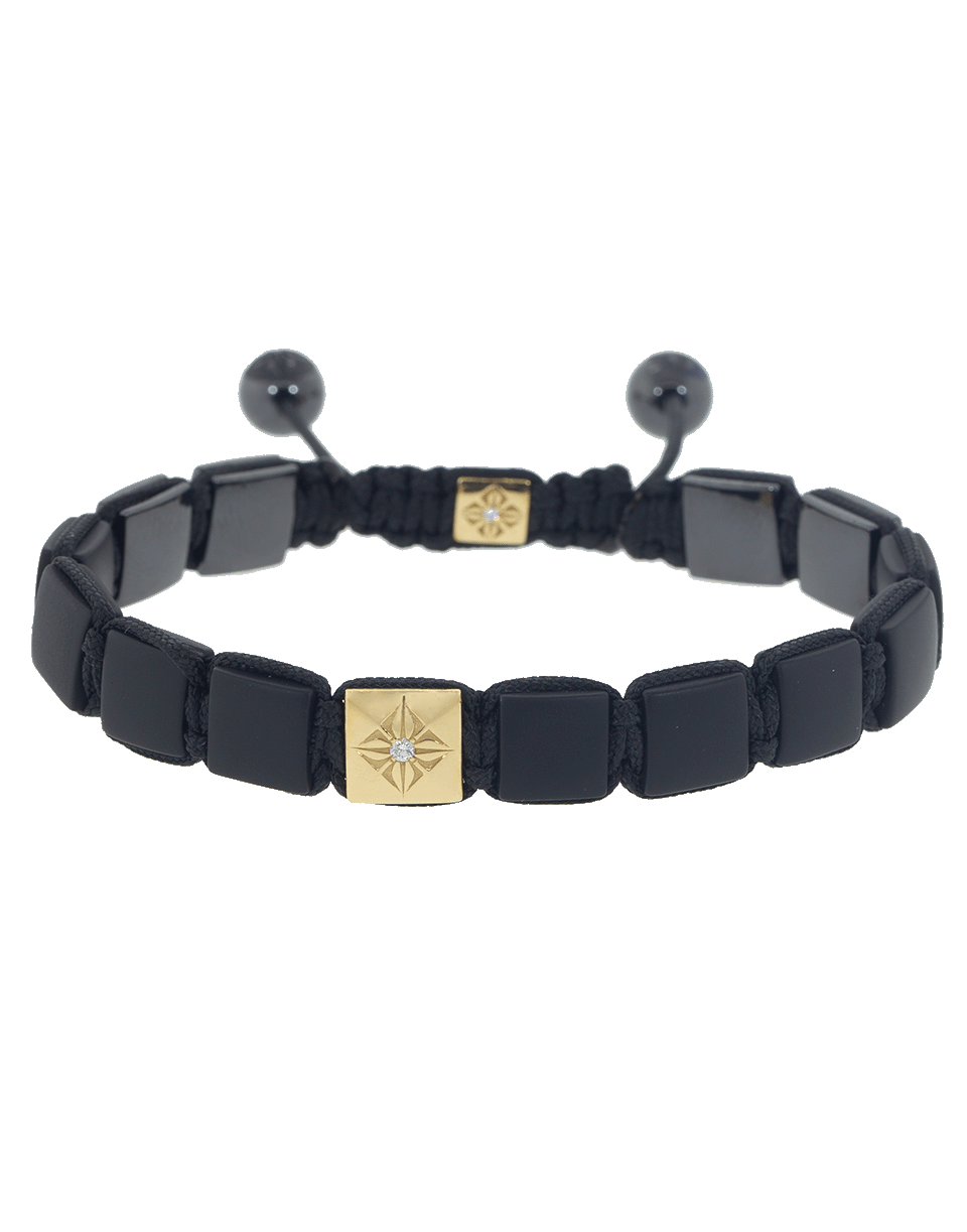 White diamond lock bracelet by Shamballa Jewels. From the Conqueror of Love Collection, this bracelet features 10mm handcrafted onyx, black ceramic and 18k yellow gold lock beads with white diamonds. It has hand-braided string that weaves the piece together and black bead details at each end.
