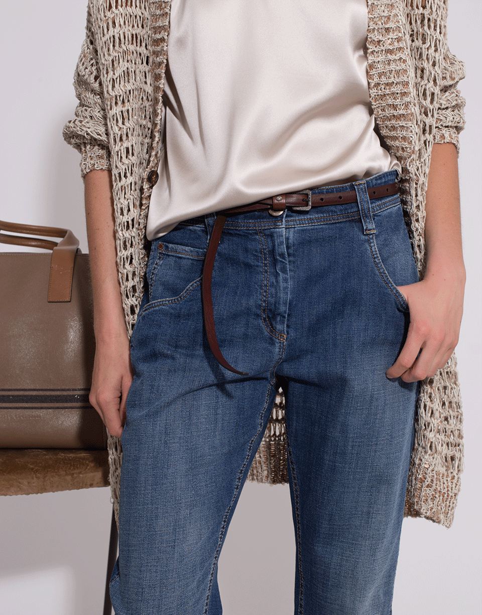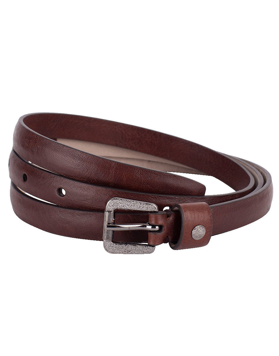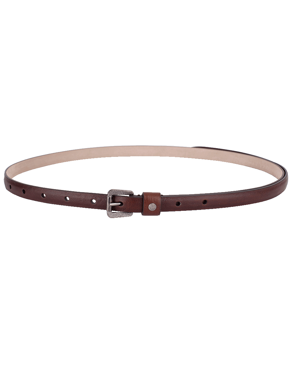 This brown skinny belt by Brunello Cucinelli is crafted from smooth calf leather and features an adjustable fit, silver hardware and a textured buckle.
