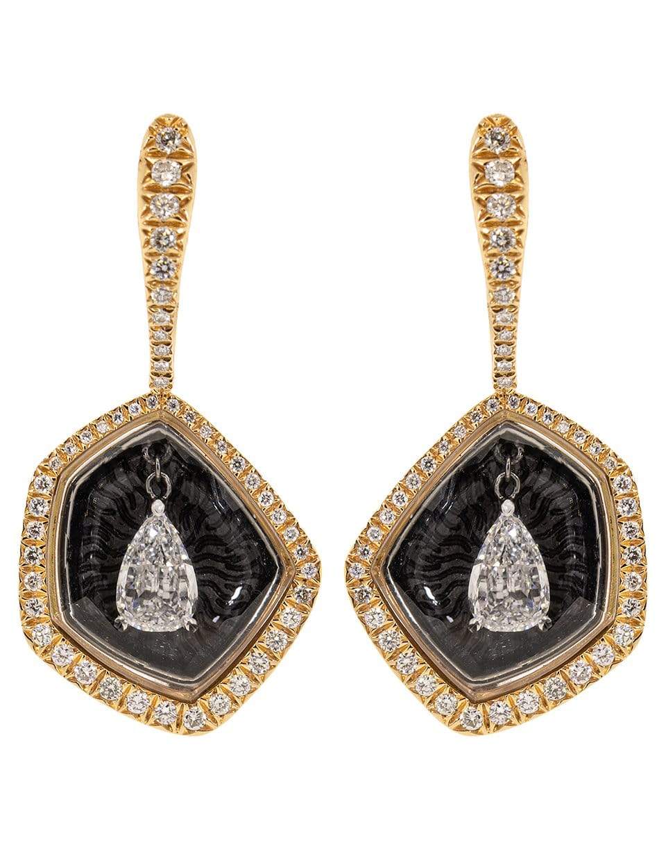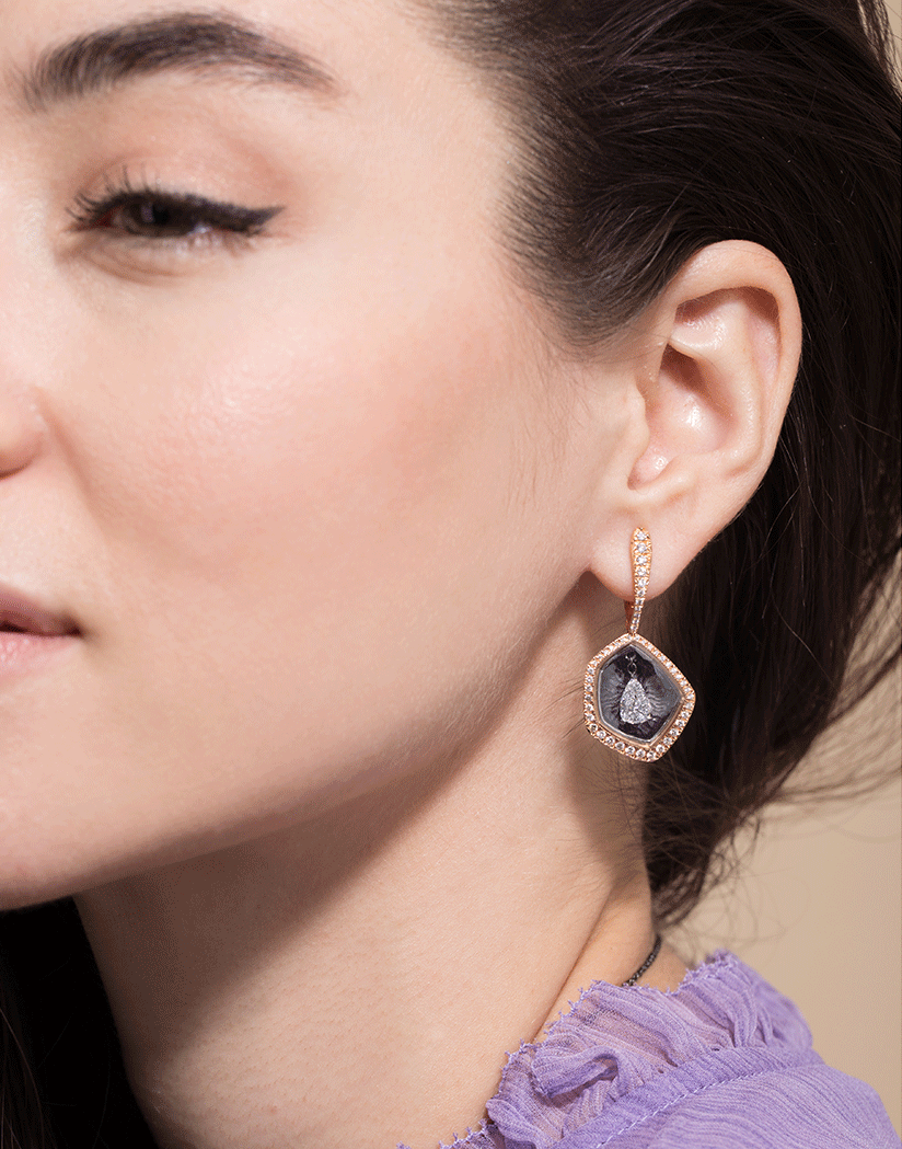 Diamond fusion pears encased in rock crystal with diamond pave rim set in 18k rose gold. For pierced ears.