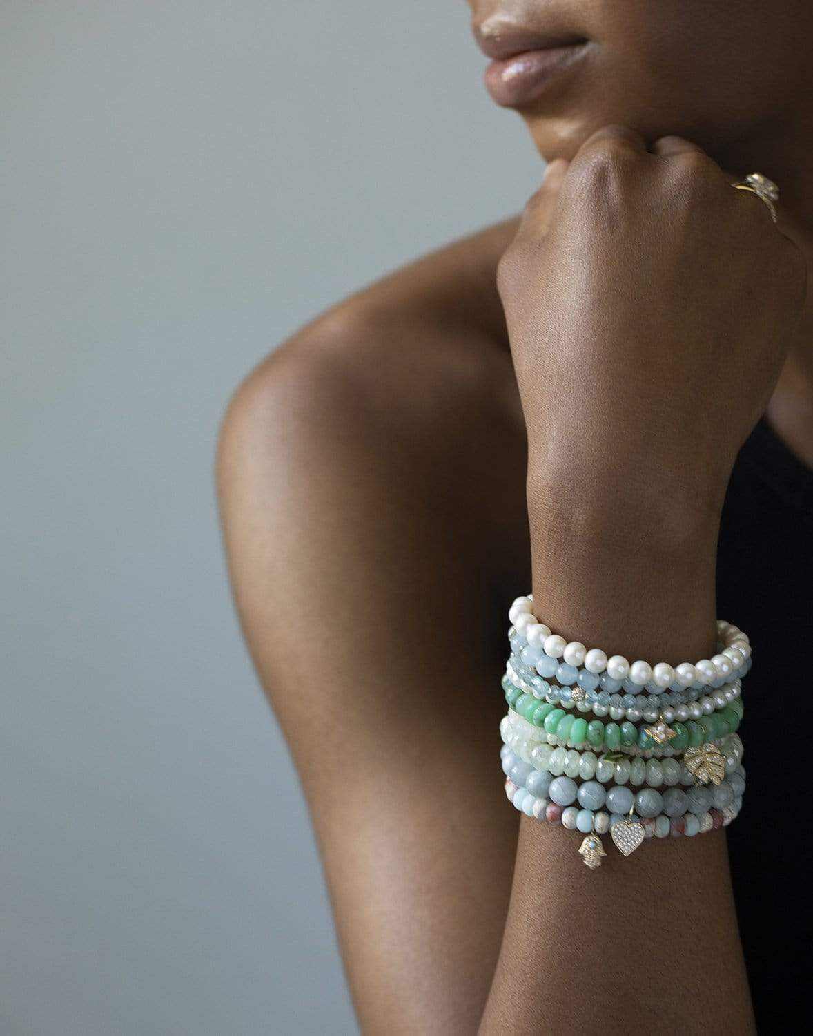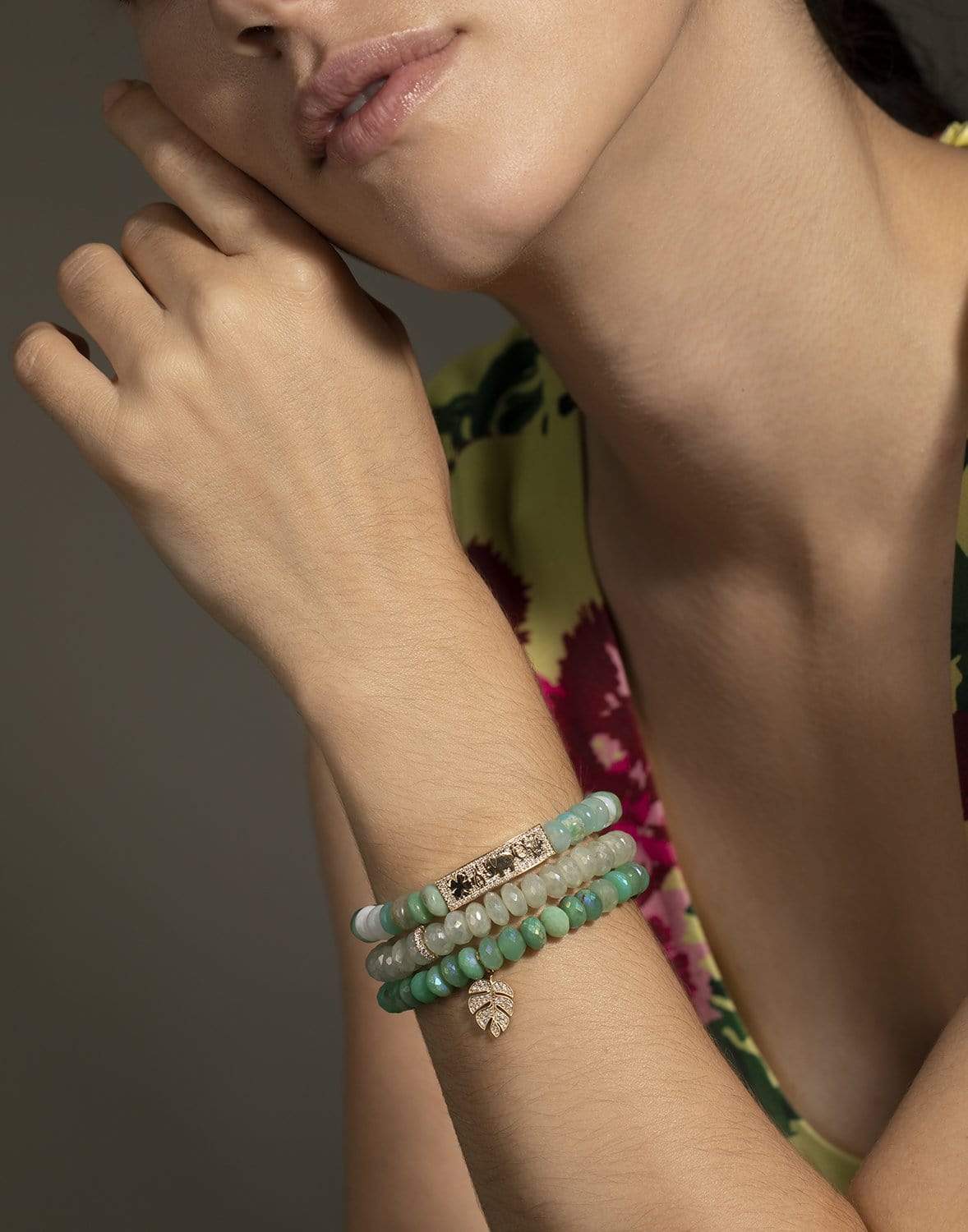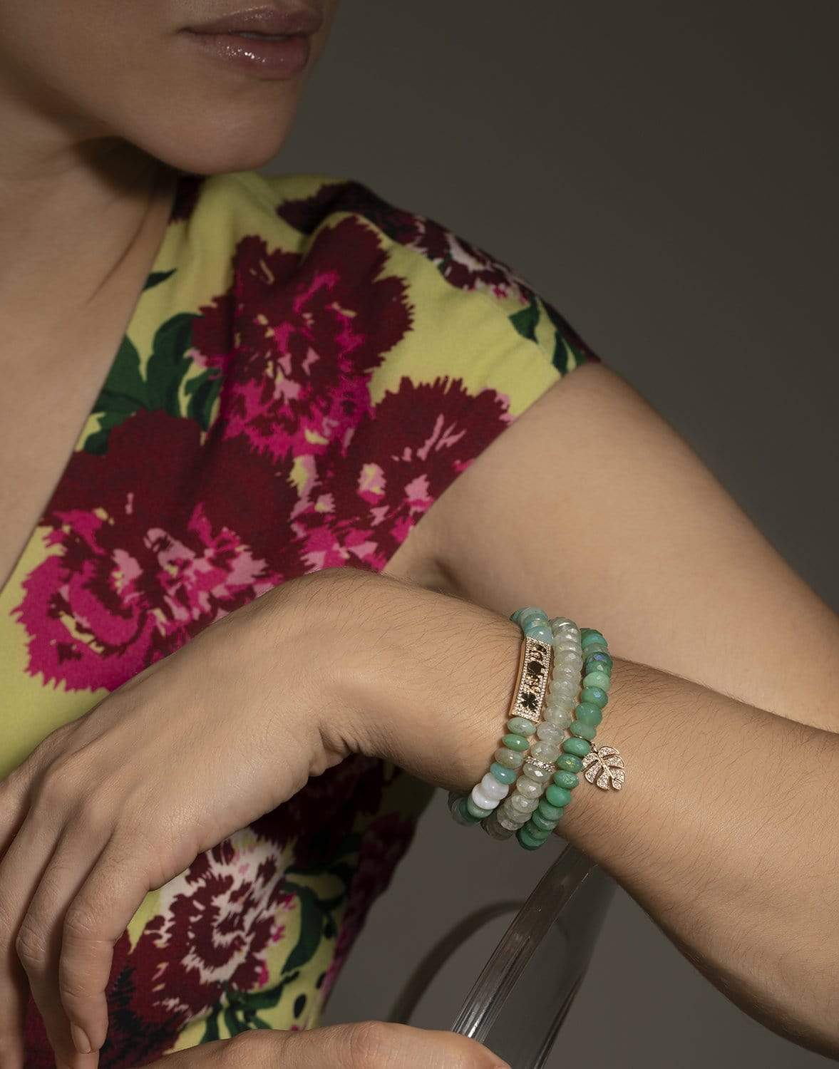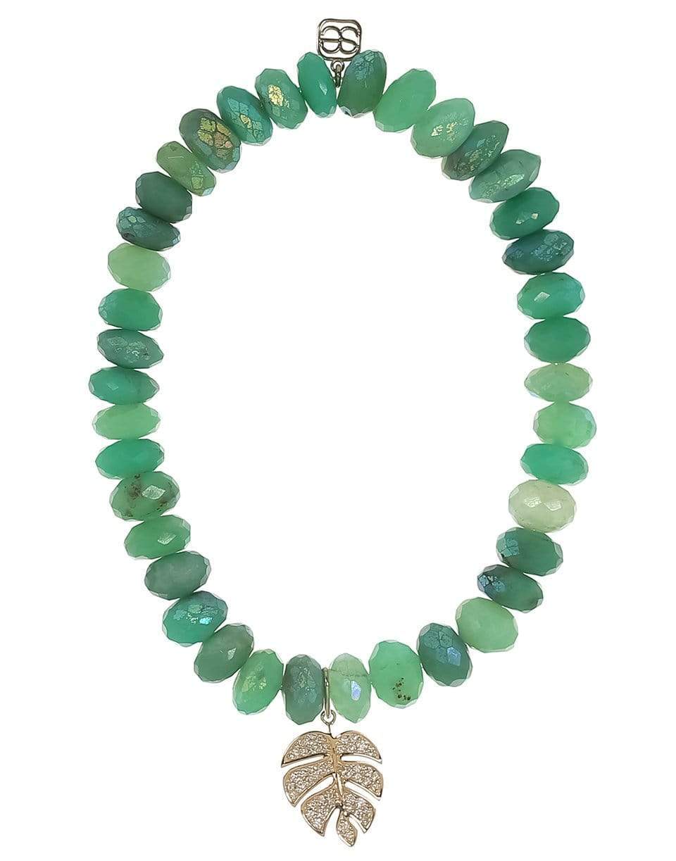 Sydney Evan Chrysoprase bead bracelet with diamond monstera leaf charm.