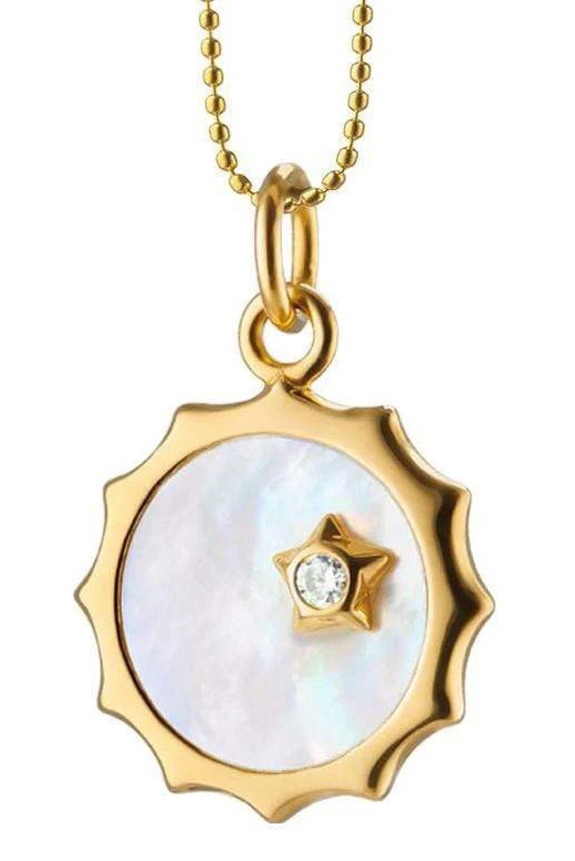 Monica Rich Kosann mother of pearl sun and star charm with diamond accent set in 18k yellow gold. Be happy! Their 18K gold sun and star "Happiness" charm features a center mother of pearl stone and diamond star accent.