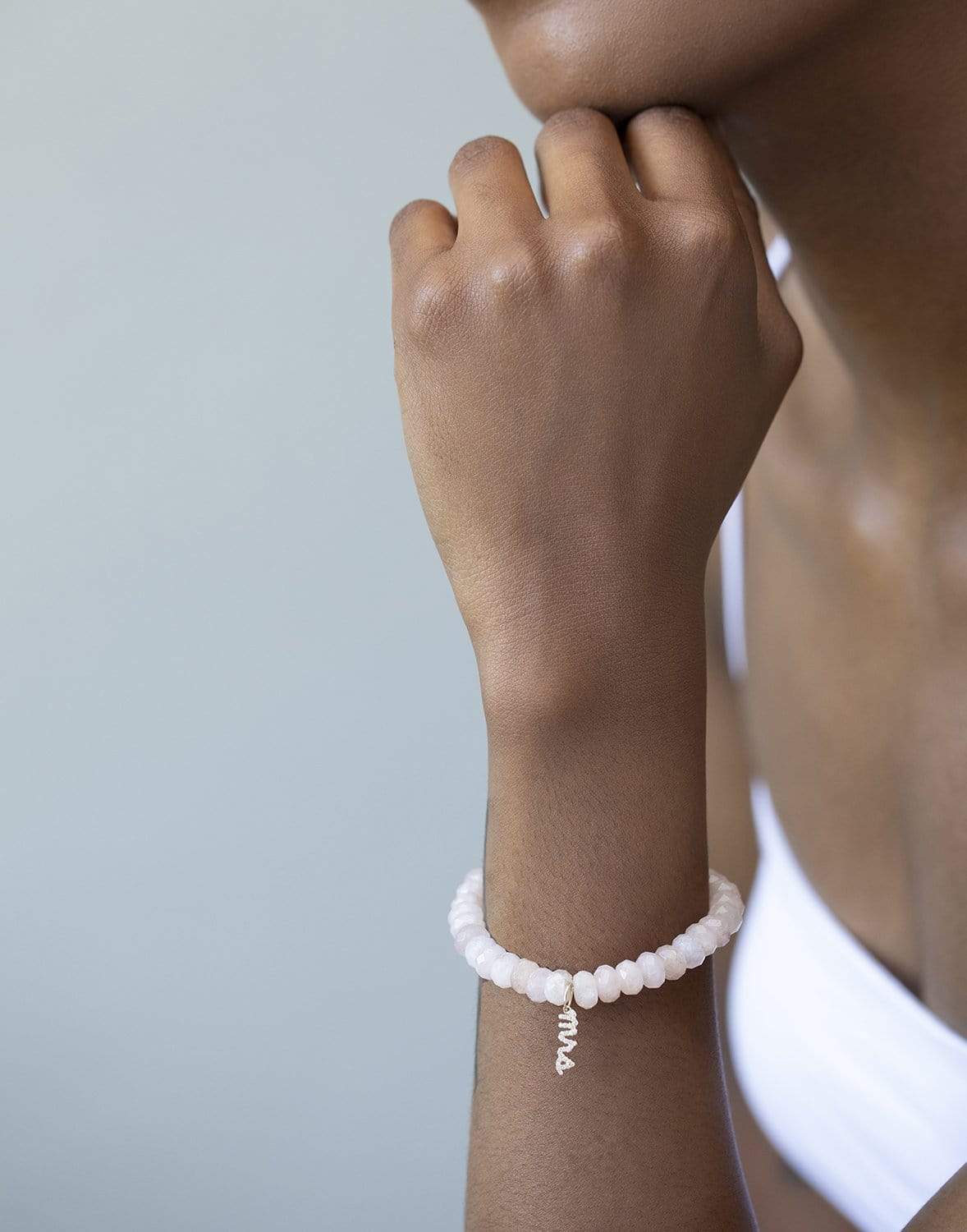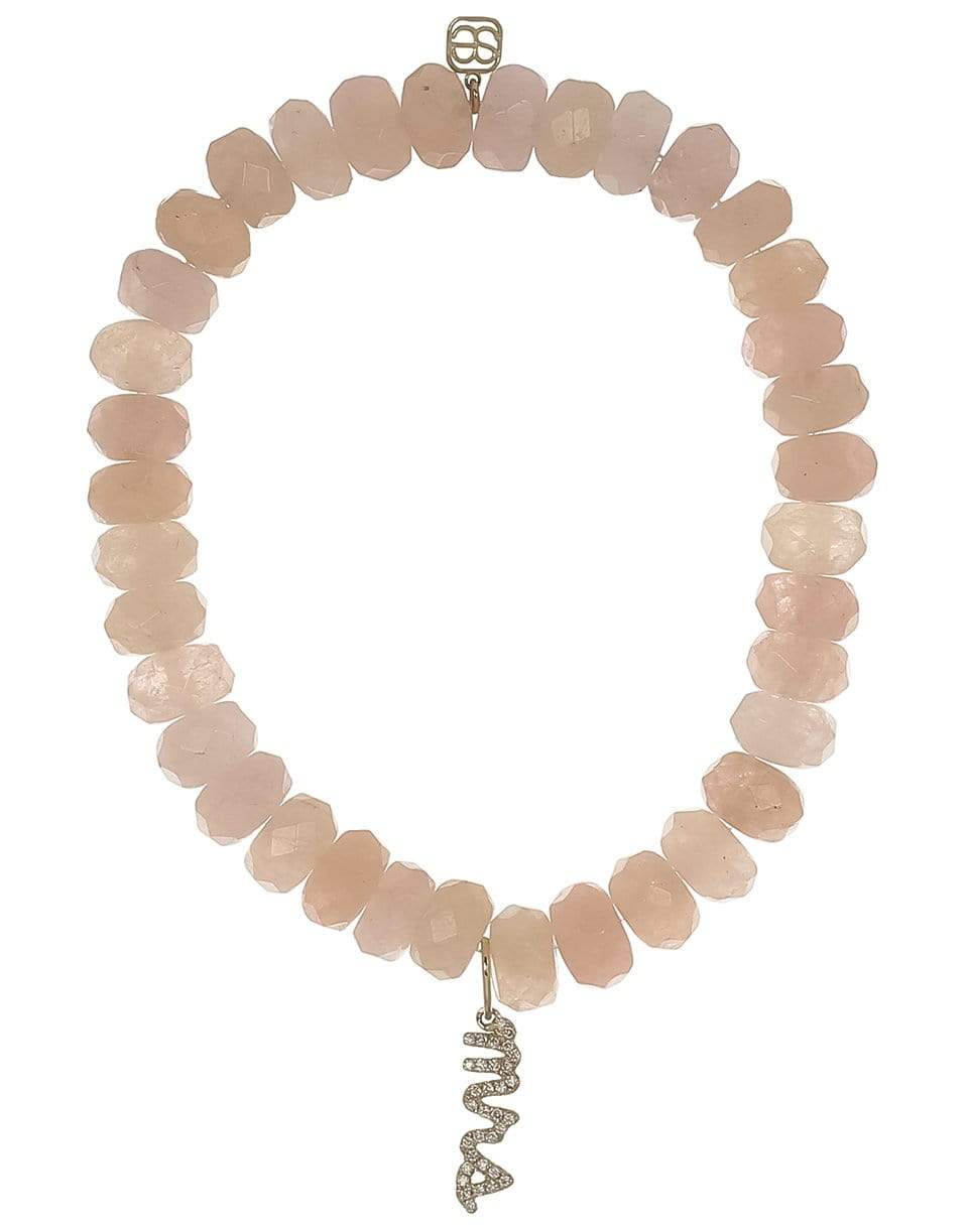 Sydney Evan faceted morganite bead bracelet with pave "Mrs" charm. All Sydney Evan beaded bracelets are strung on a stretch cord along with the 14k gold SE logo charm.