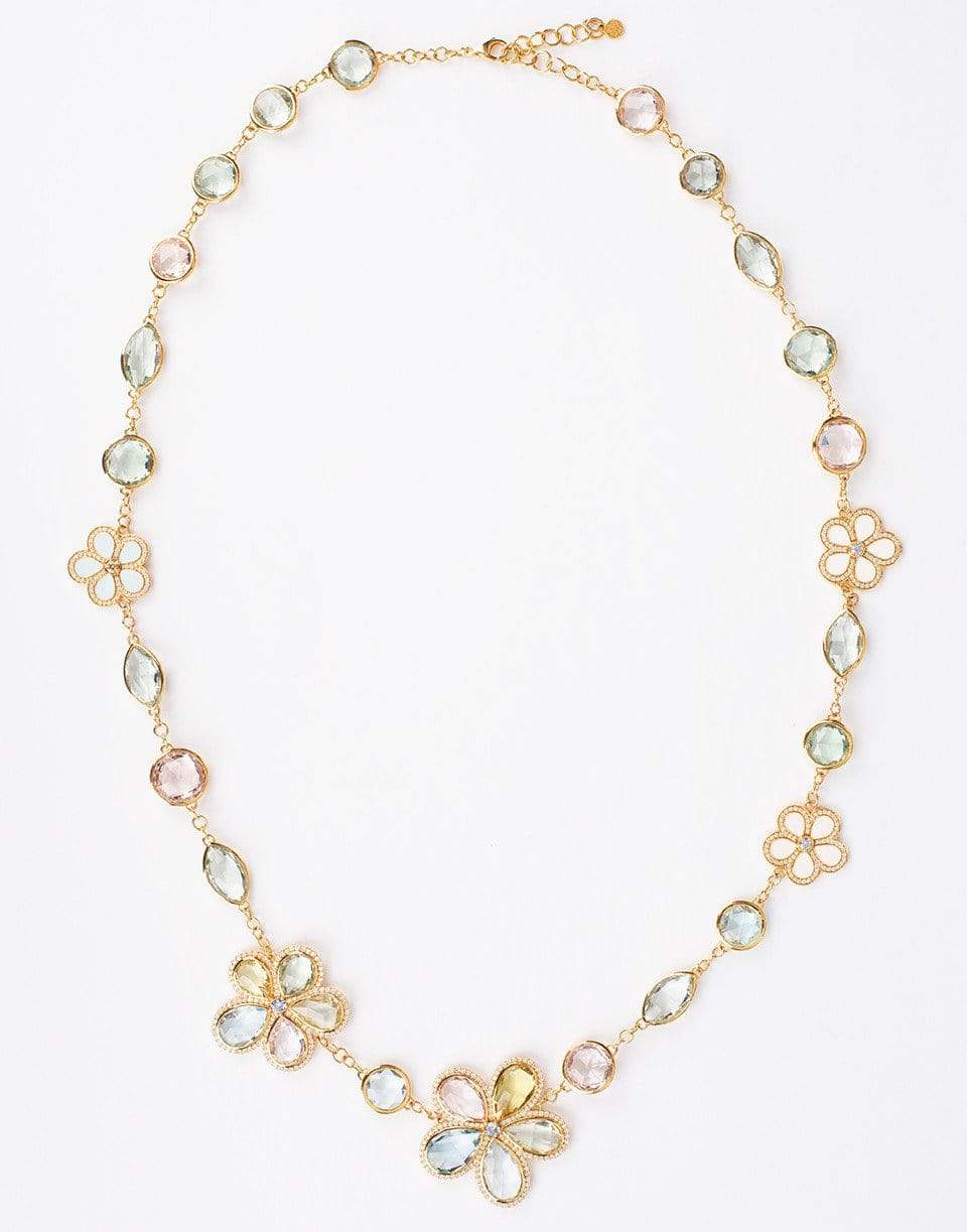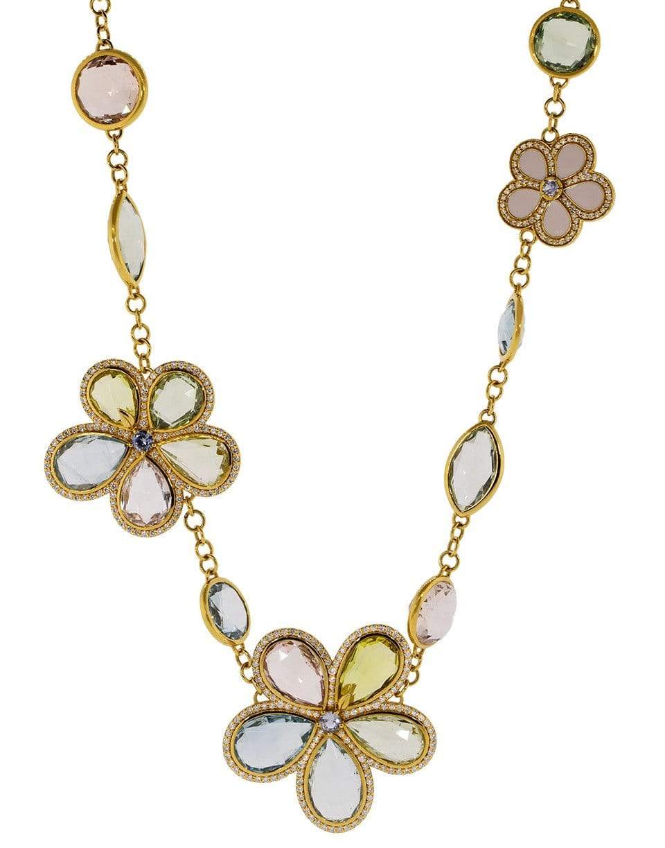 Cut out flower necklace with beryl, prasiolite, diamonds, blue and yellow sapphires set in 20k yellow gold.