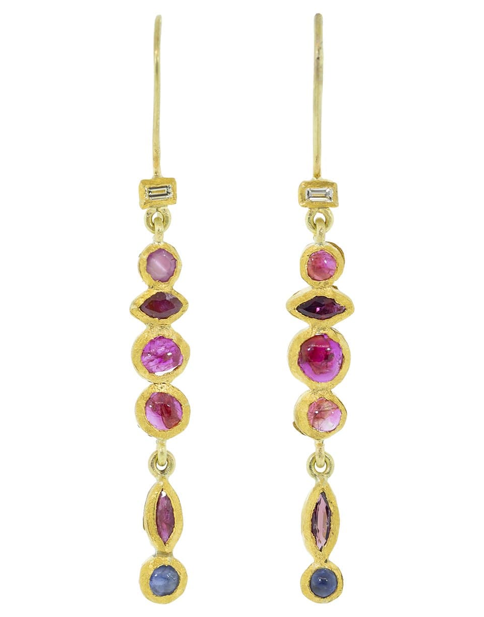 Boaz Kashi drop earrings with diamonds, sapphires, and tourmaline set in 24k Yellow gold. For pierced ears.