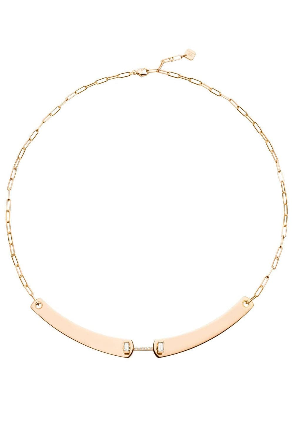 Nouvel Heritage dinner date mood necklace. There is something so charming about baguette diamonds! Inspired by our iconic bracelet of the Mood Collection, the Dinner Date Mood Necklace is an everyday statement jewelry piece. Made with 18k gold and diamonds, this adjustable necklace is the perfect addition to your carefully curated neck-mess.