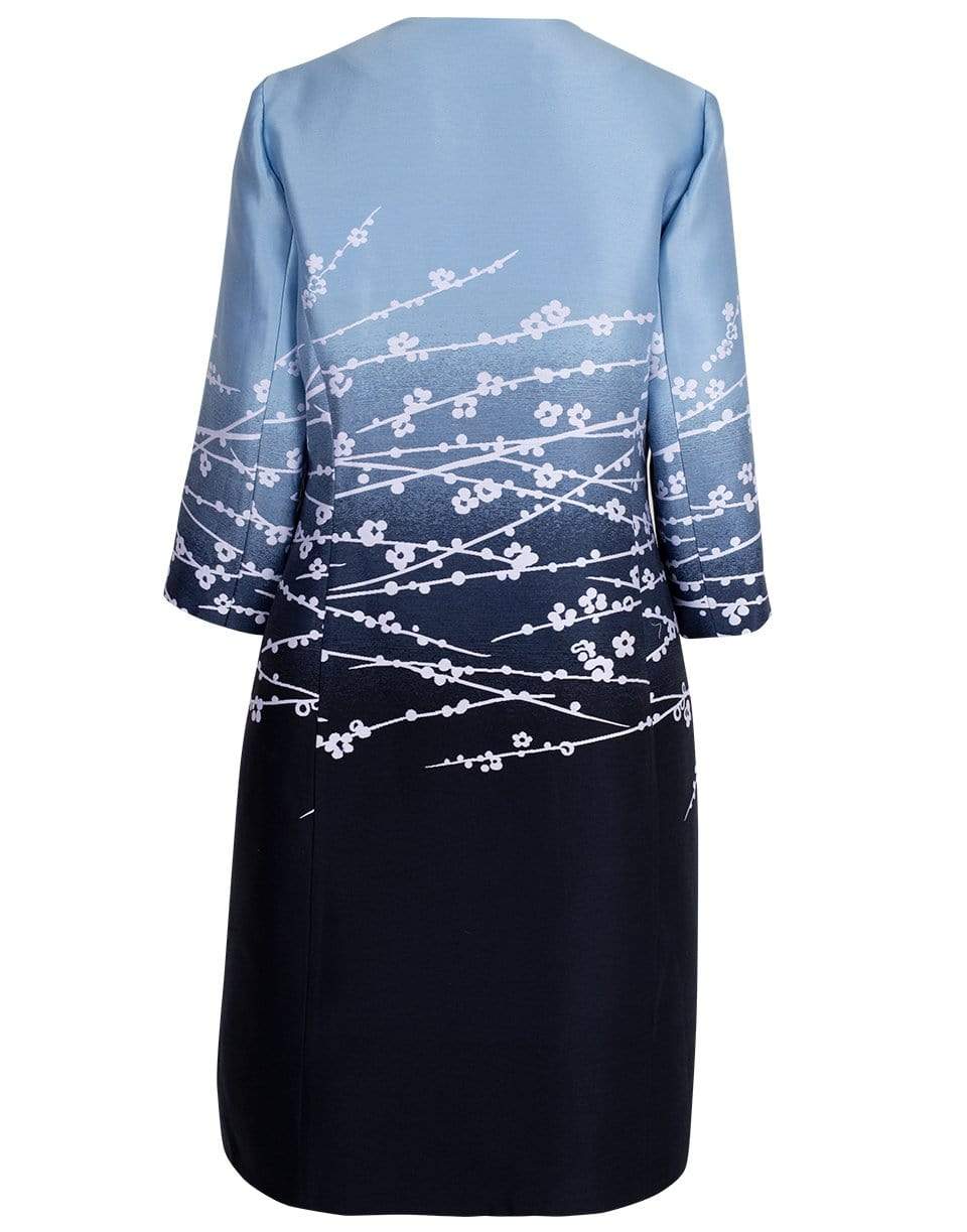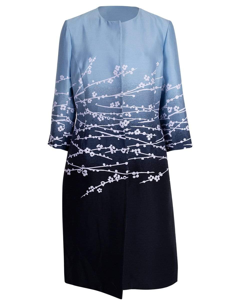 Dip Dye Cherry Blossom Jacquard Coat from Oscar de la Renta featuring a mid-length, regular fit, elbow length sleeves, side pockets, round neckline, and open front.