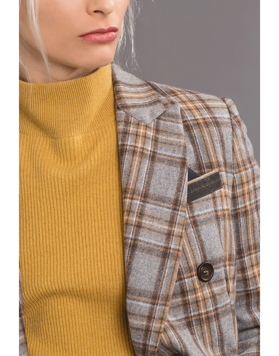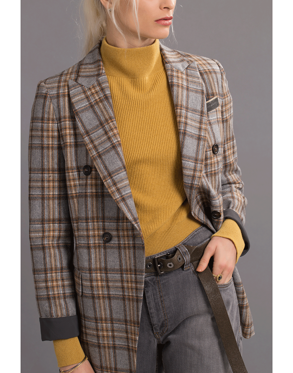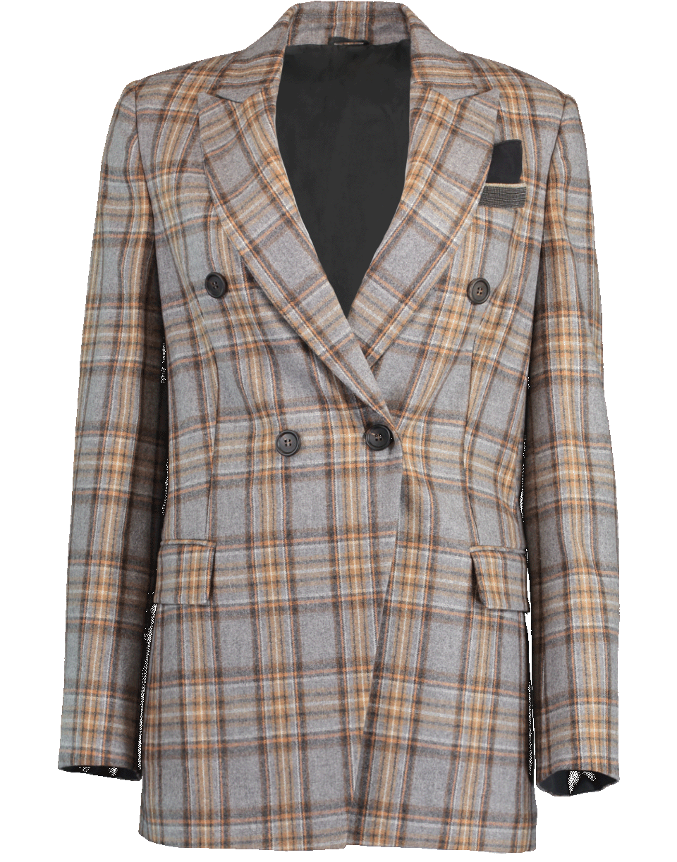Lightweight flannel plaid double breasted jacket from Brunello Cucinelli featuring a regular fit with long sleeves, a spread collar, monili trim pocket and silk pocket square.