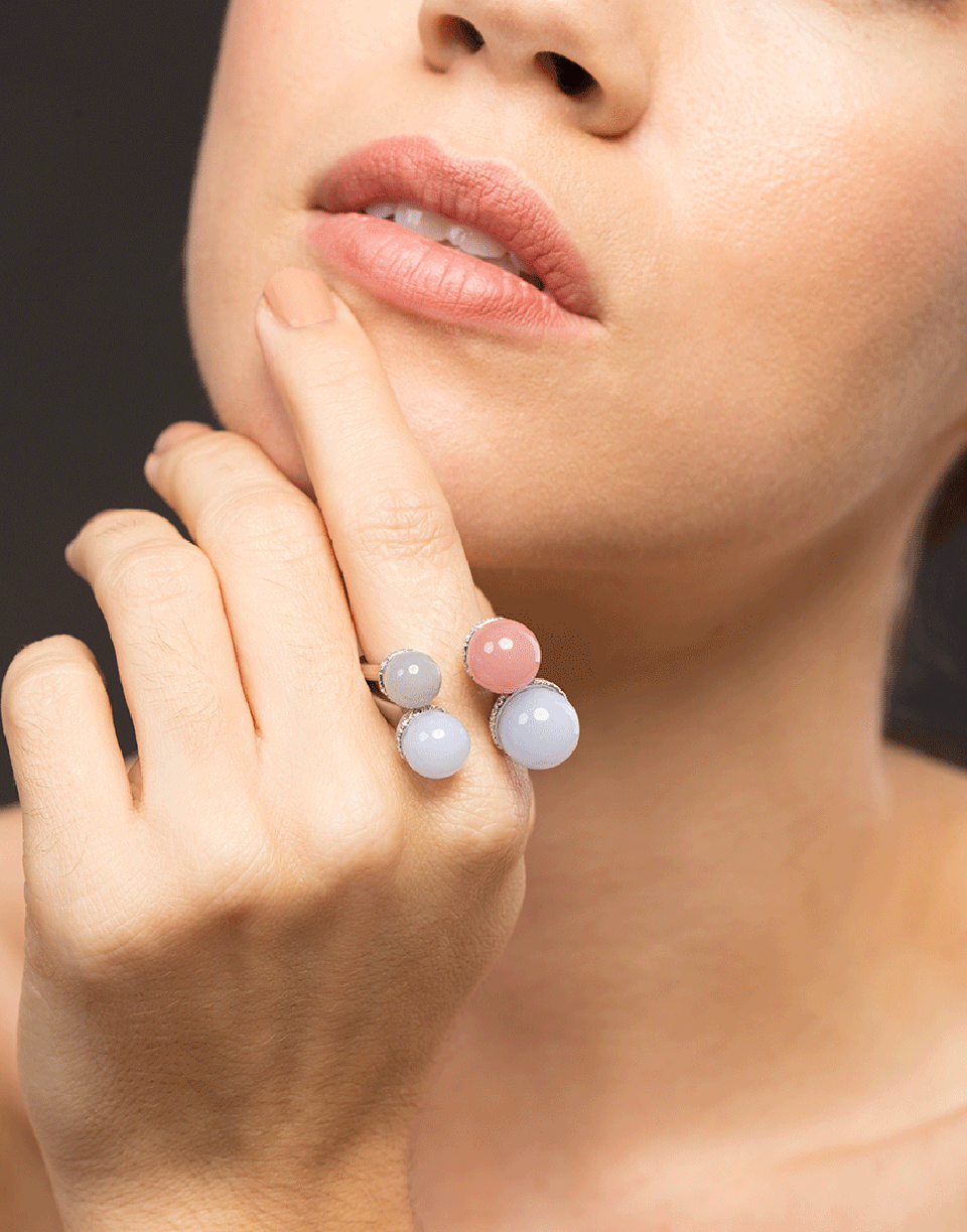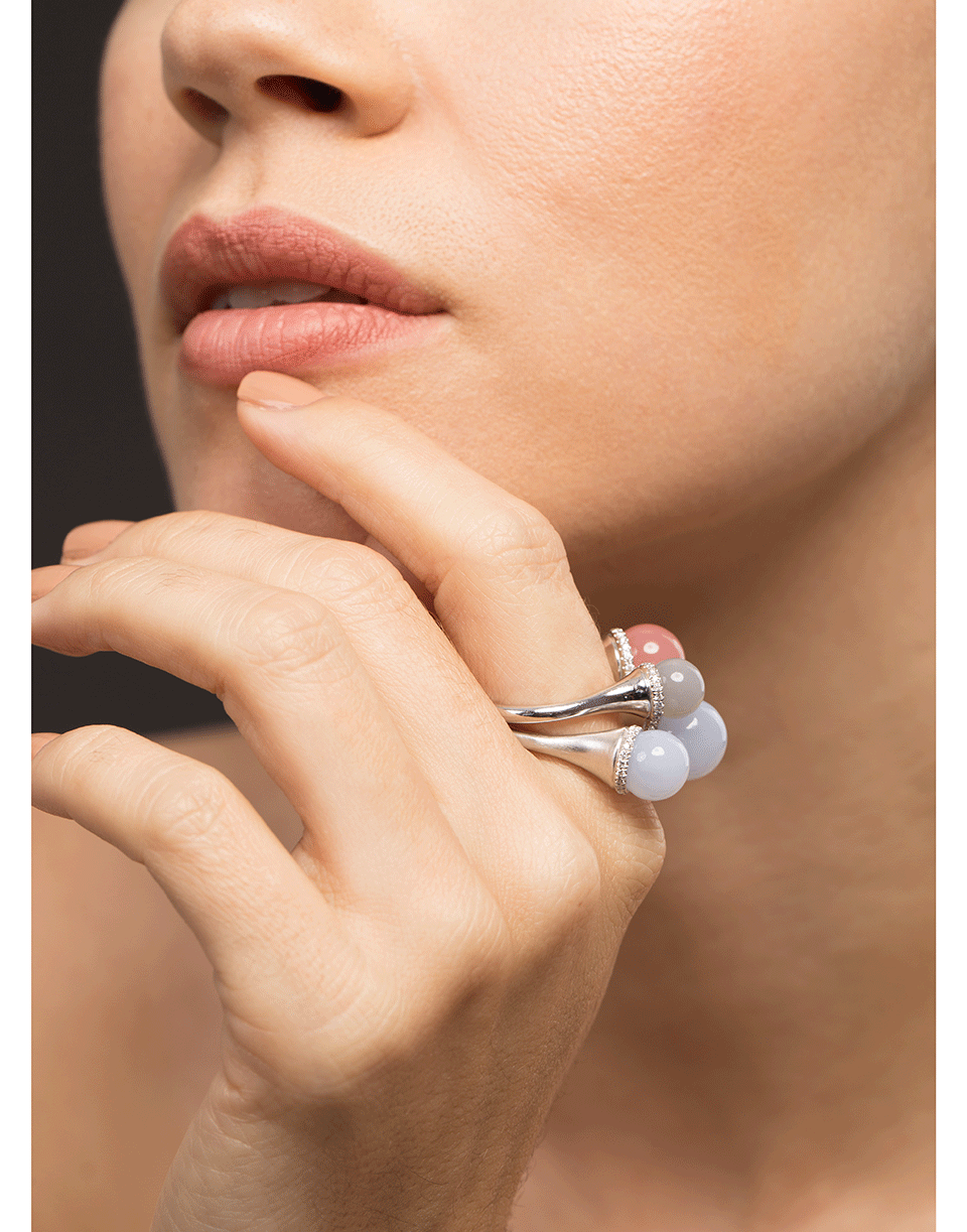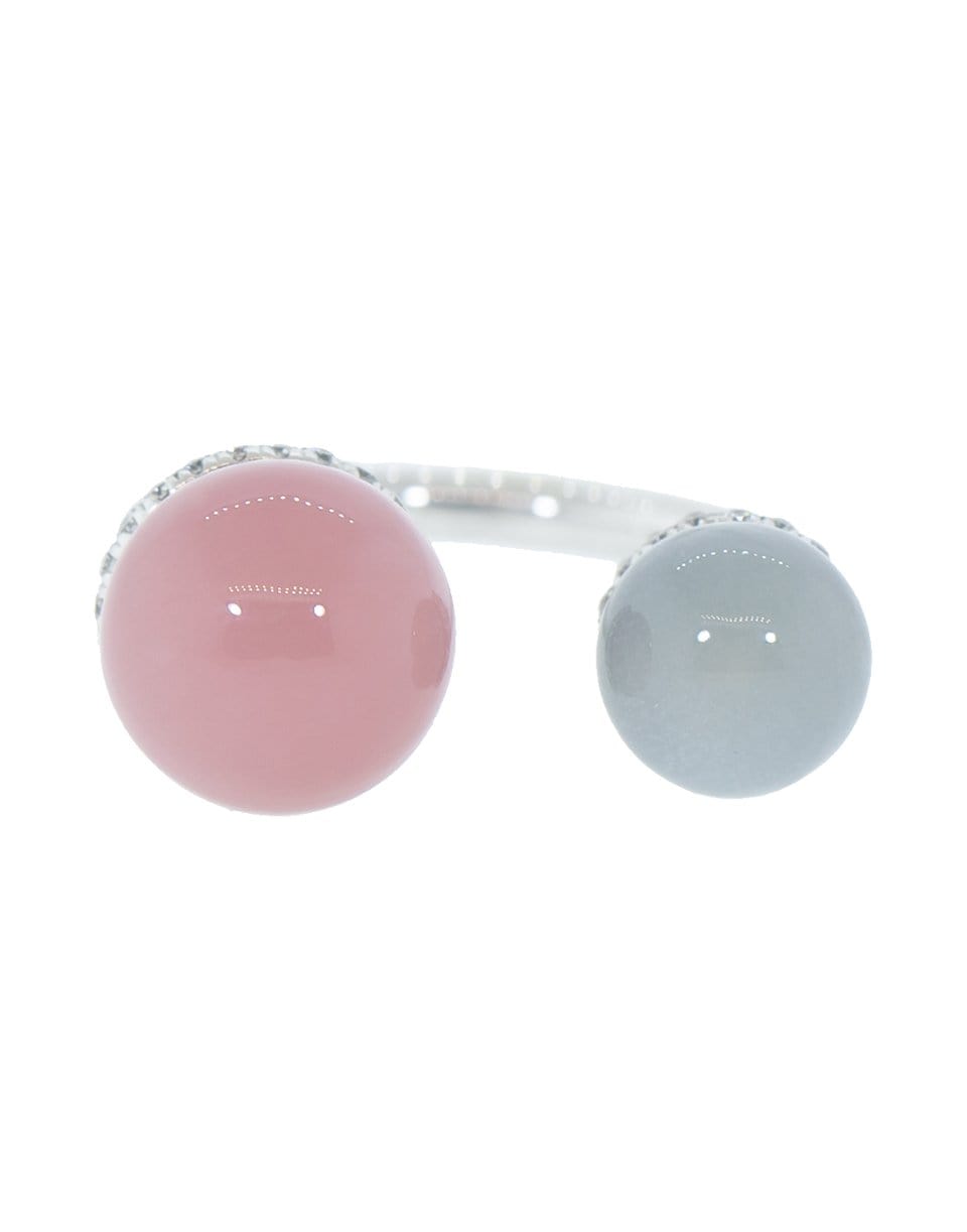 Guita M double tip moonstone and rhodocrosite ring with diamonds set in 18k white gold.
