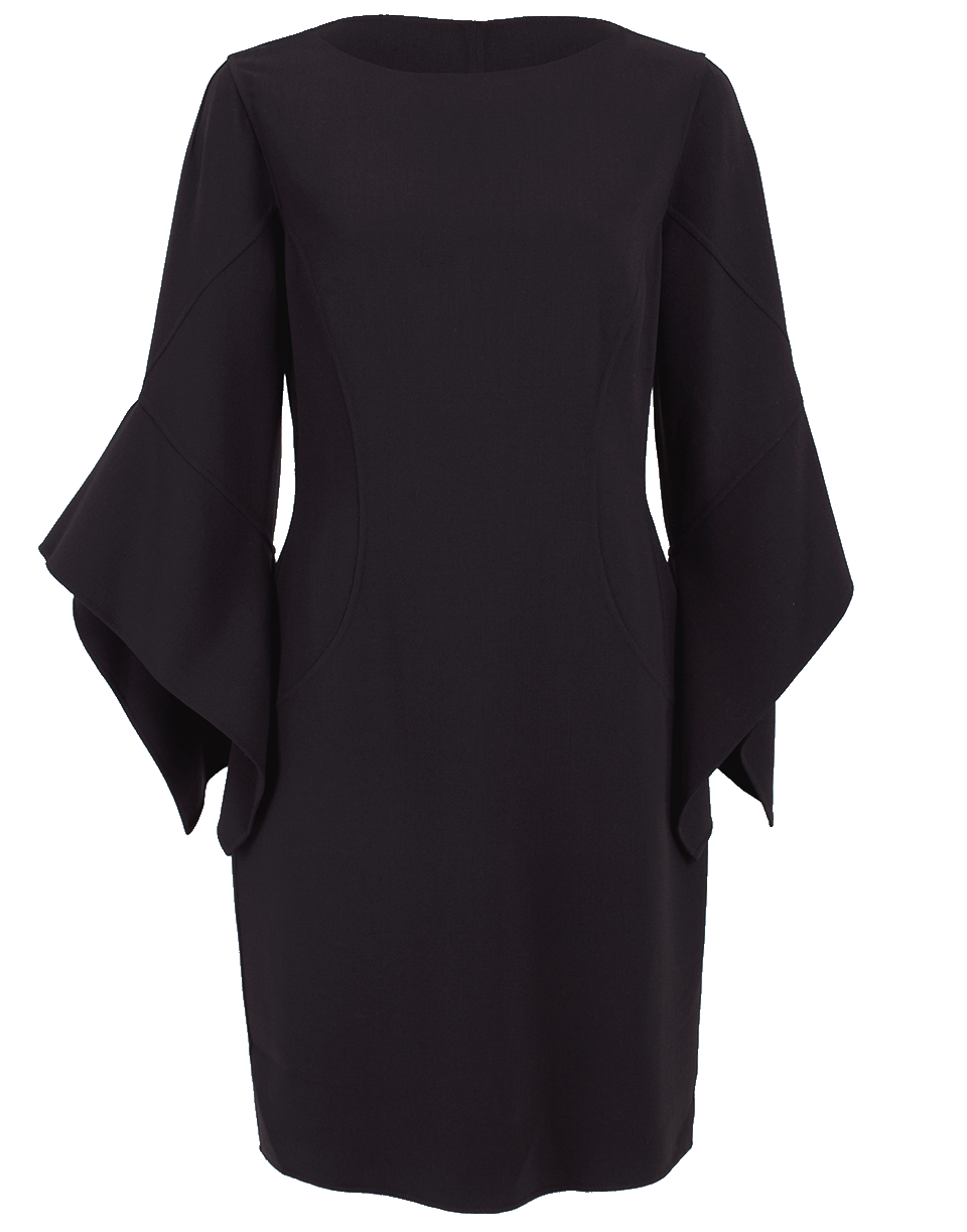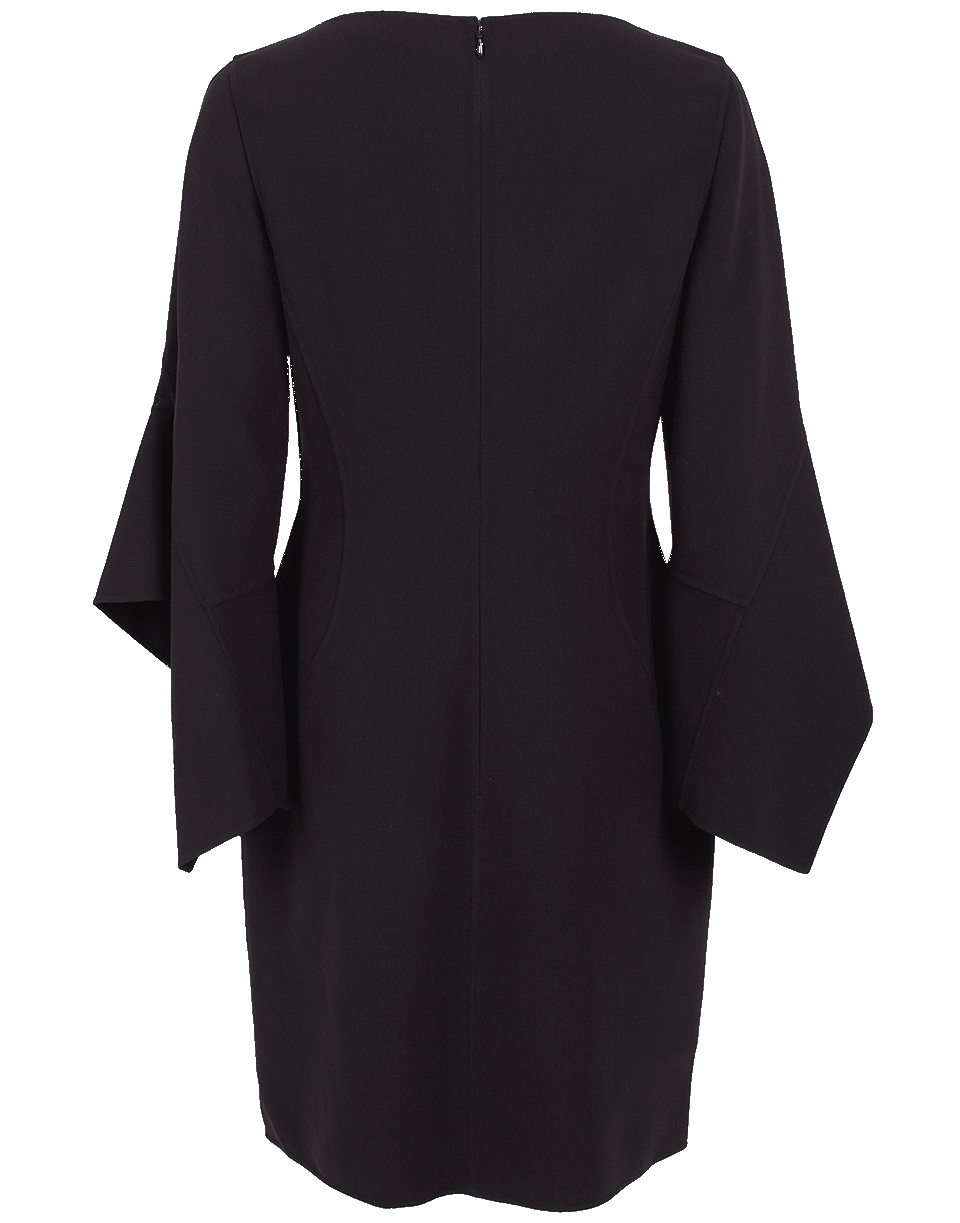 This black Michael Kors cocktail dress in stretch crepe features a boat neckline, long draped bell sleeves, sheath silhouette, knee length, and a concealed back zip.