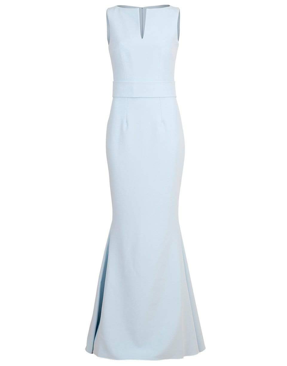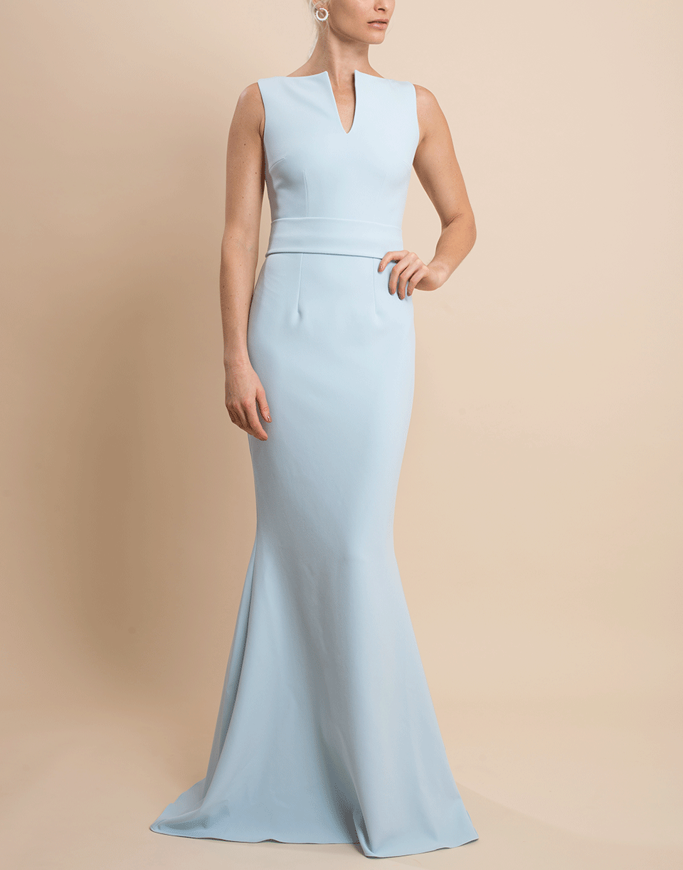 Safiyaa heavy crepe Eclat sleeveless V-neck gown with a flattering mermaid silhouette, detachable waist belt, and a concealed zip closure.
