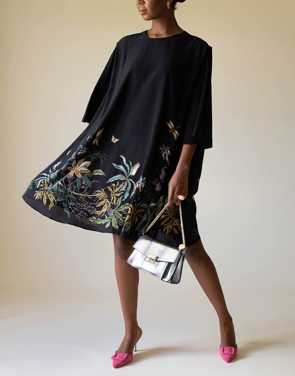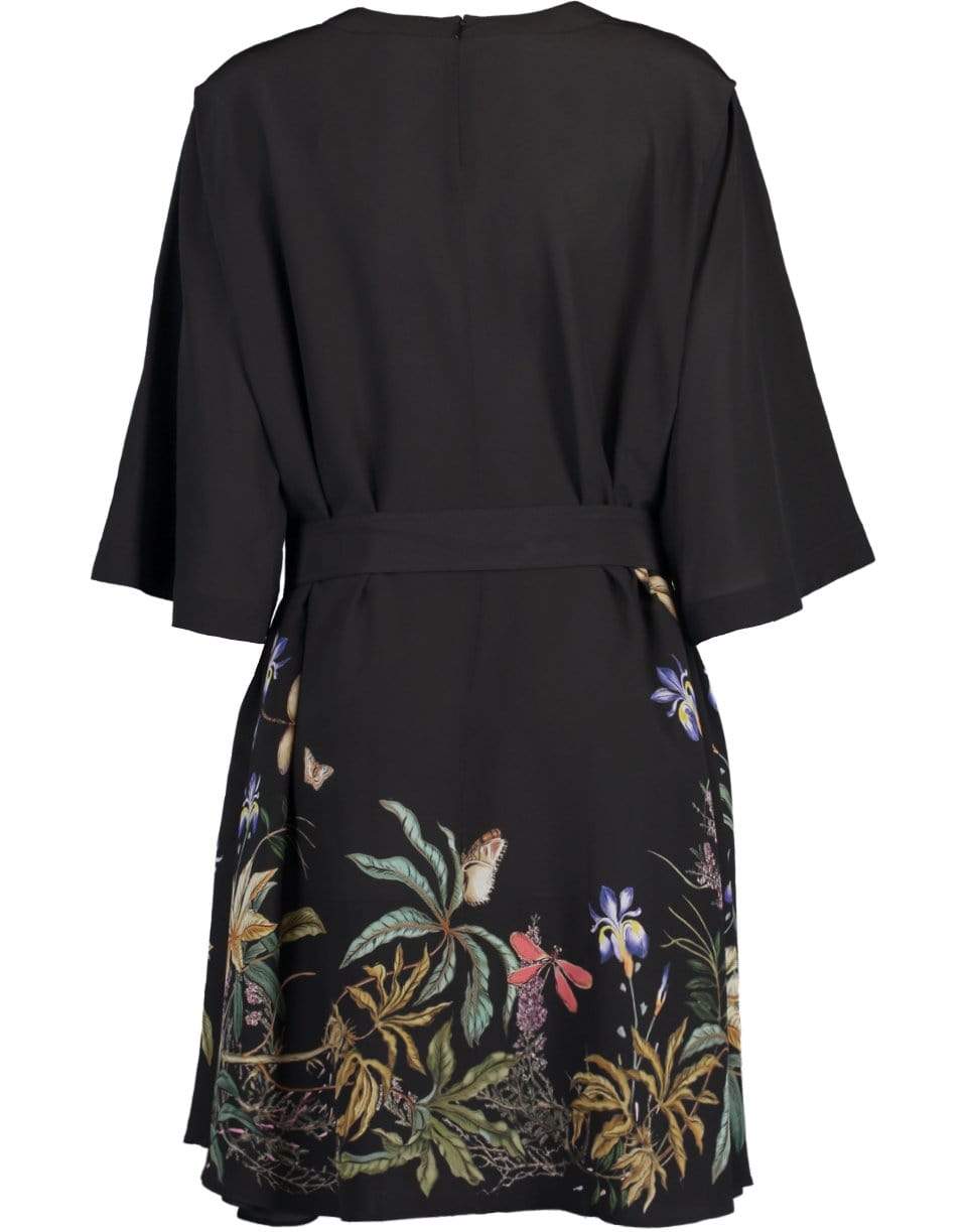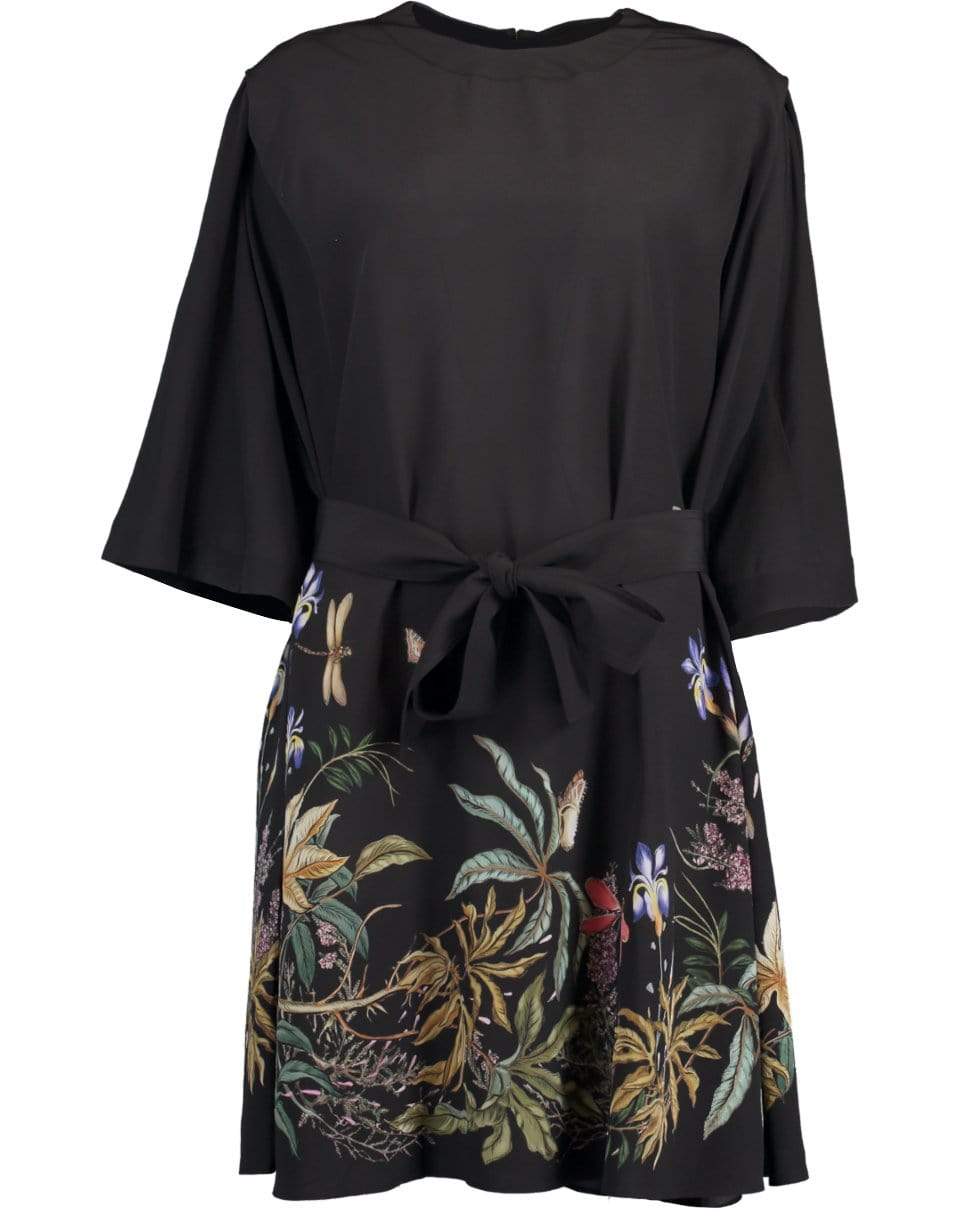 Givenchy silk crepe de chine goddess of the rainbow belted T-shirt dress with elbow length sleeves, round neck, zip closure at back, side pockets, regular fit, and a knee length.