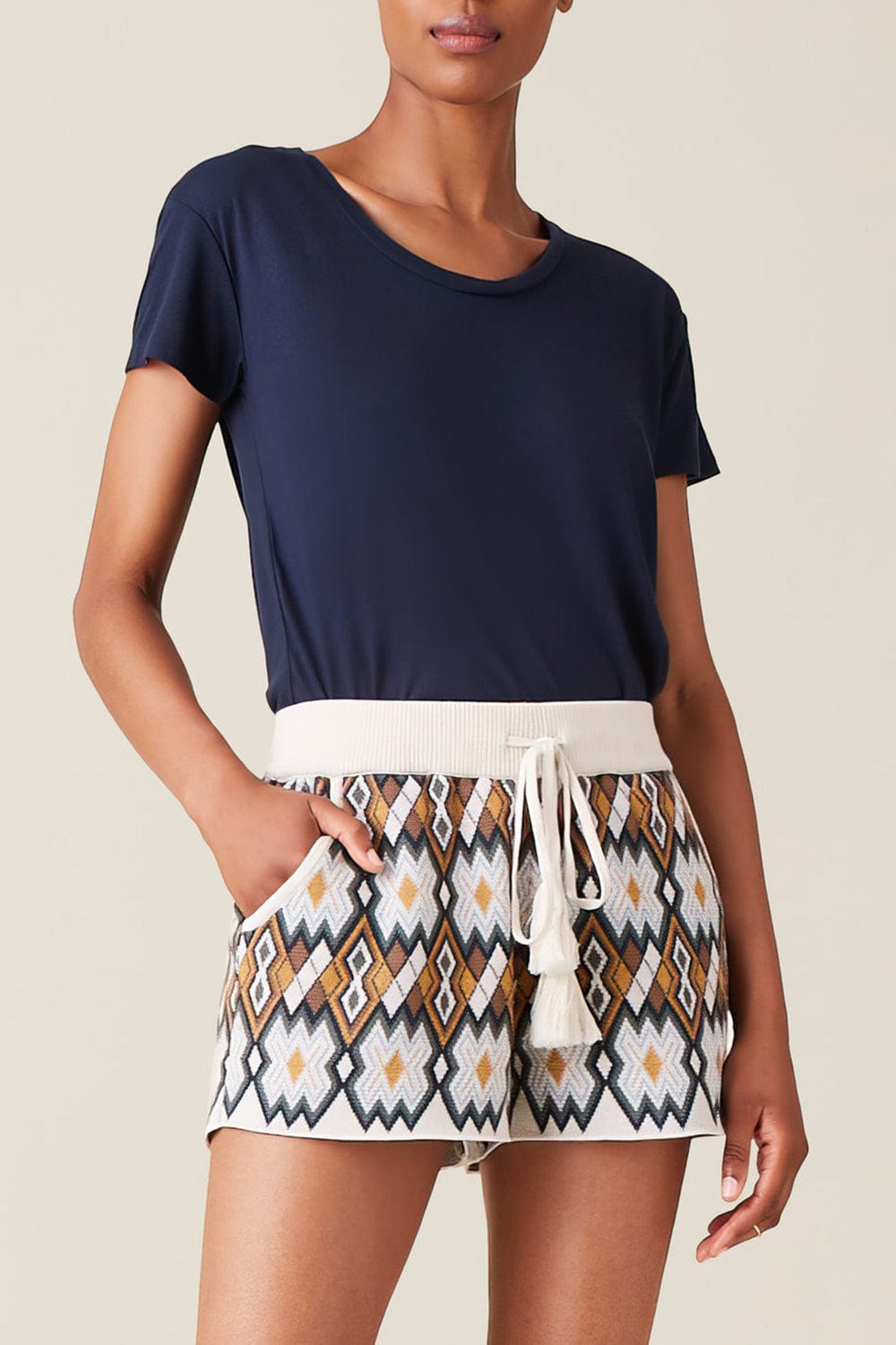 Figue elina short in mustang. Knitted from sumptuous cotton, these shorts have the perfect length, elasticated waist, and contrast stitching detail.