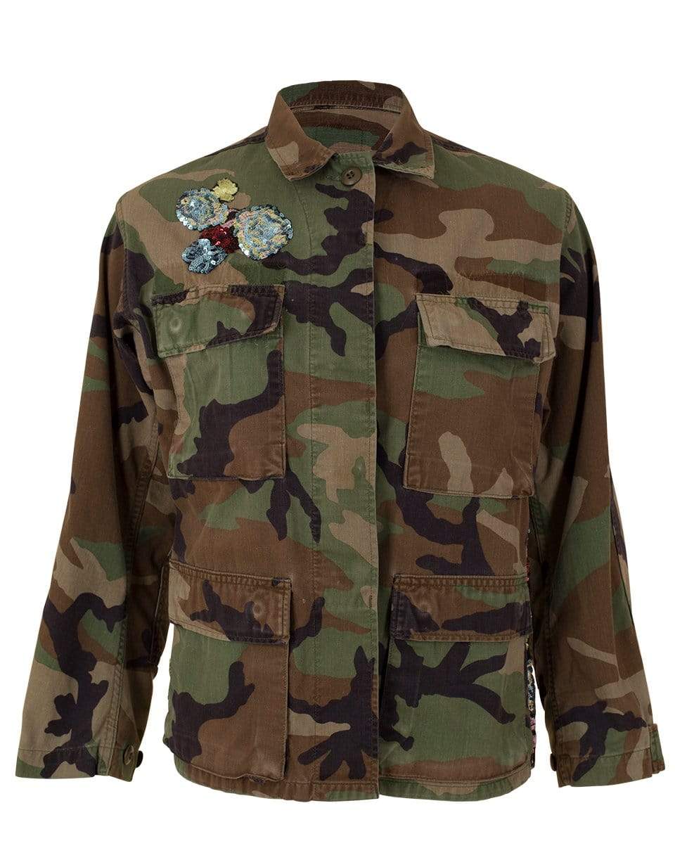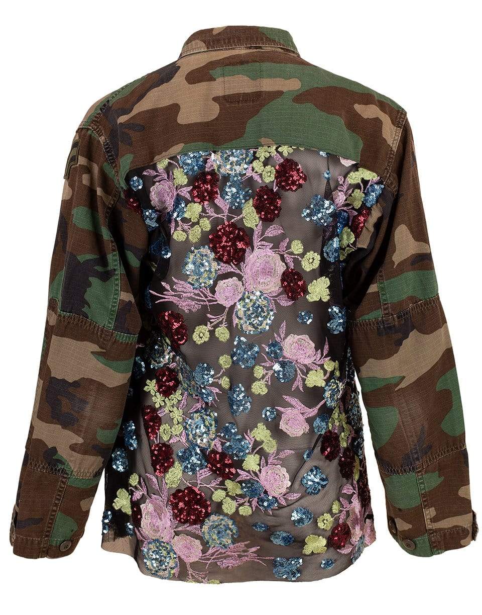 This Josie Bruno Vintage camo military jacket is "re-made" for a modern twist with sequined floral embellishments at shoulder and a mesh back. It features a raw hem, spread collar, concealed button placket, long sleeves, and four chest patch flap pockets.